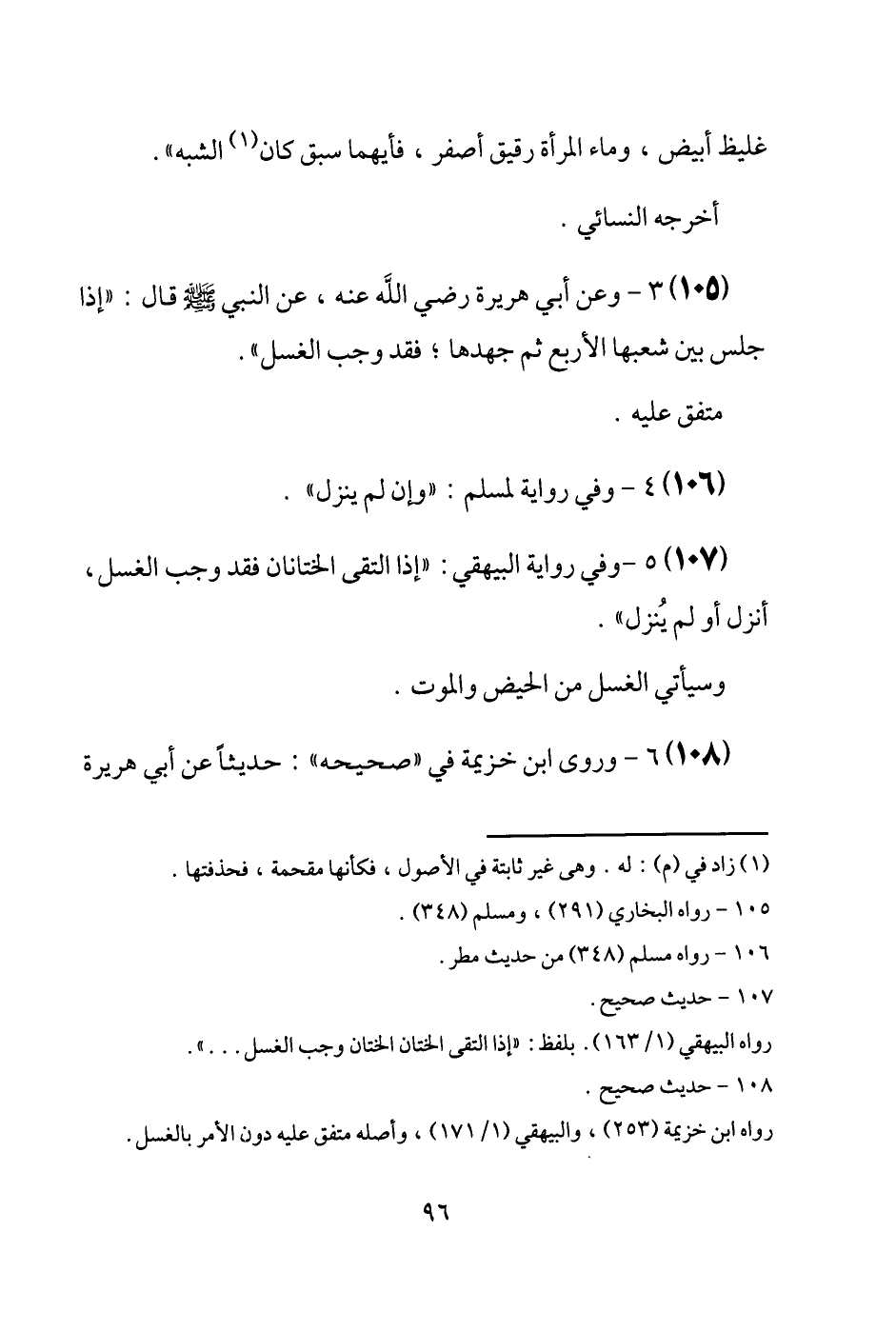 (107) وَفِي رِوَايَة الْبَيْهَقِيّ: " إِذا التقَى الختانان فقد وَجب الْغسْل، أنزل أَو لم يُنزل ". وَسَيَأْتِي الْغسْل من الْحيض وَالْمَوْت.