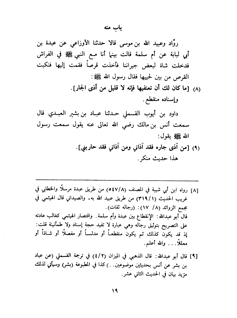 رواد وعبيد الله بن موسى قالا حدثنا الأوزاعي عن عبدة بن أبي لبابة عن أم سلمة قالت بينما أنا مع النبي صلى الله عليه وسلم في الفراش فدخلت شاة لبعض جيراننا فأخذت قرصاً فقمت إليها فنكبت القرص من بين لحييها فقال رسول الله صلى الله عليه وسلم: (ما كان لك أن تعنفيها فإنه لا قليل من أذى الجار) .