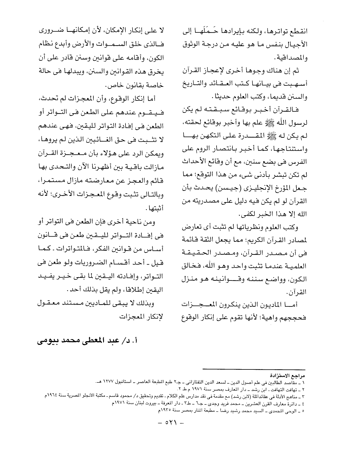 (ب) المقصد الثانى: الذى من أجله أنزل الله تعالى القرآن الكريم أن يكون معجزة ناطقة فى فم الدنيا بصدق النبى صلى الله عليه وسلم فيما يبلغه عن ربه وشاهدة بأن هذا القرآن ليس من كلام مخلوق، وإنما هو من كلام الخالق عز وجل، والدليل الساطع على أن هذا القرآن هو المعجزة الكبرى للرسول صلى الله عليه وسلم التى تحدى الناس جميعا أن يأتوا بمثله فعجزوا، ثم تحداهم أن يأتوا بسورة واحدة من مثله فنكصوا على أعقابهم وانقلبوا خاسرين. قال تعالى {وان كنتم فى ريب مما نزلنا على عبدنا فأتوا بسورة من مثله، وادعوا شهداءكم من دون الله إن كنتم صادقين. فإن لم تفعلوا ولن تفعلوا فاتقوا النار التى وقودها الناس والحجارة أعدت للكافرين} البقرة:23 - 24.