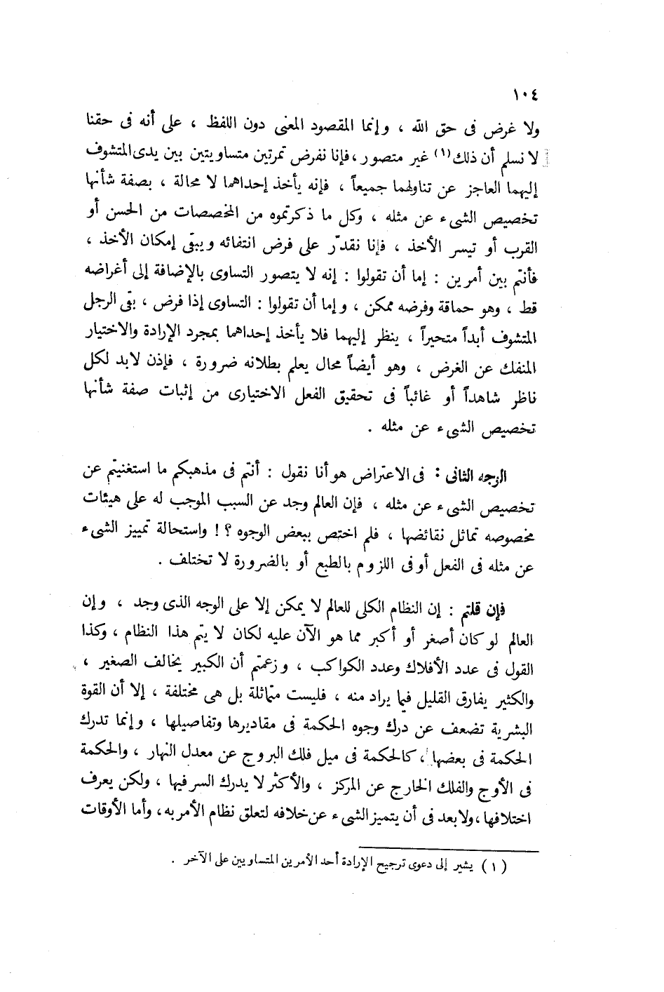 فإن قلتم: إن النظام الكلي للعالم لا يمكن إلا على الوجه الذي وجد، وإن العالم لو كان أصغر أو أكبر مما هو الآن عليه لكان لا يتم هذا النظام، وكذا القول في عدد الأفلاك وعدد الكواكب. وزعمتم أن الكبير يخالف الصغير والكثير يفارق القليل في ما يراد منه فليست متماثلة بل هي مختلفة، إلا أن القوة البشرية تضعف عن درك وجوه الحكمة في مقاديرها وتفاصيلها وإنما تدرك الحكمة في بعضها كالحكمة في ميل فلك البروج عن معدل النهار والحكمة في الأوج والفلك الخارج المركز، والأكثر لا يدرك السر فيها ولكن يعرف اختلافها، ولا بعد في أن يتميز الشيء عن خلافه لتعلق نظام الأمر به. وأما الأوقات