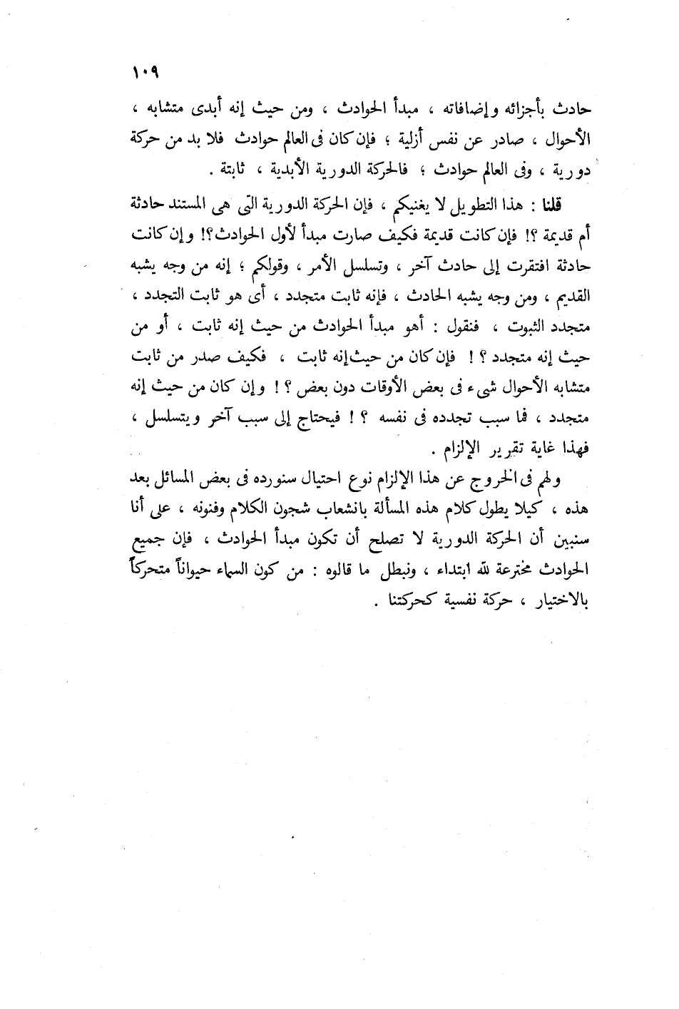 سيأتي الكلام عن ذلك ولهم في الخروج عن هذا الإلزام نوع احتيال سنورده في بعض المسائل بعد هذه كيلا يطول كلام هذه المسألة بانشعاب شجون الكلام وفنونه. على أنا سنبين أن الحركة الدورية لا يصلح أن تكون مبدأ الحوادث وأن جميع الحوادث مخترعة لله ابتداءً، ونبطل ما قالوه من كون السماء حيواناً متحركاً بالاختيار حركة نفسية كحركاتنا.