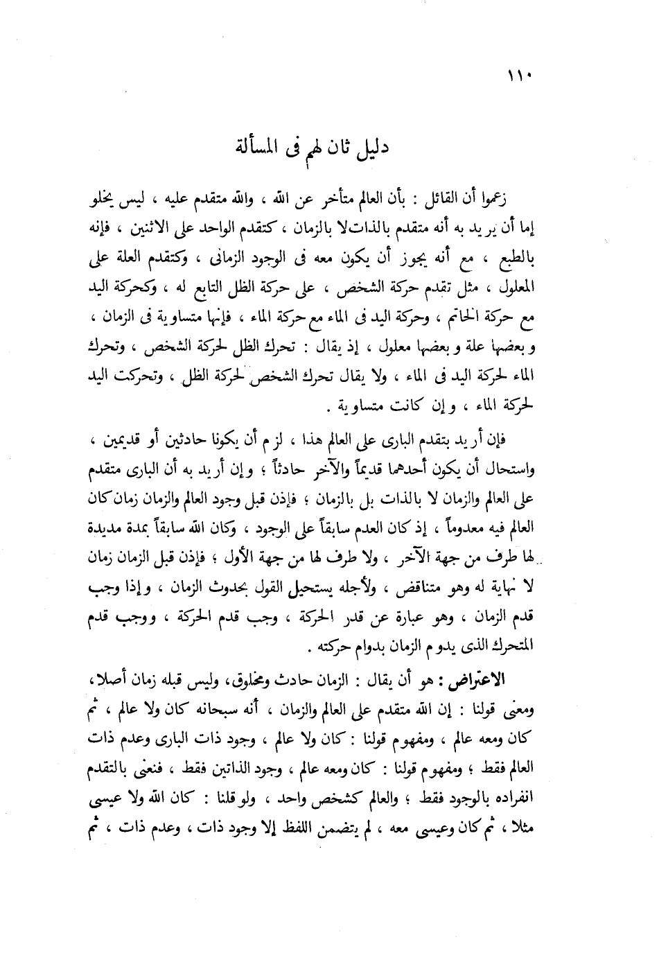 الاعتراض هو أن يقال: الزمان حادث ومخلوق وليس قبله زمان أصلاً، ونعني بقولنا إن الله متقدم على العالم والزمان إنه كان ولا عالم ثم كان ومعه عالم. ومفهوم قولنا: كان ولا عالم، وجود ذات الباري وعدم ذات العالم فقط، ومفهوم قولنا: كان ومعه عالم، وجود الذاتين فقط. فنعني بالتقدم انفراده بالوجود فقط، والعالم كشخص واحد. ولو قلنا: كان الله ولا عيسى مثلاً ثم كان وعيسى معه لم يتضمن اللفظ إلا وجود ذات وعدم ذات ثم