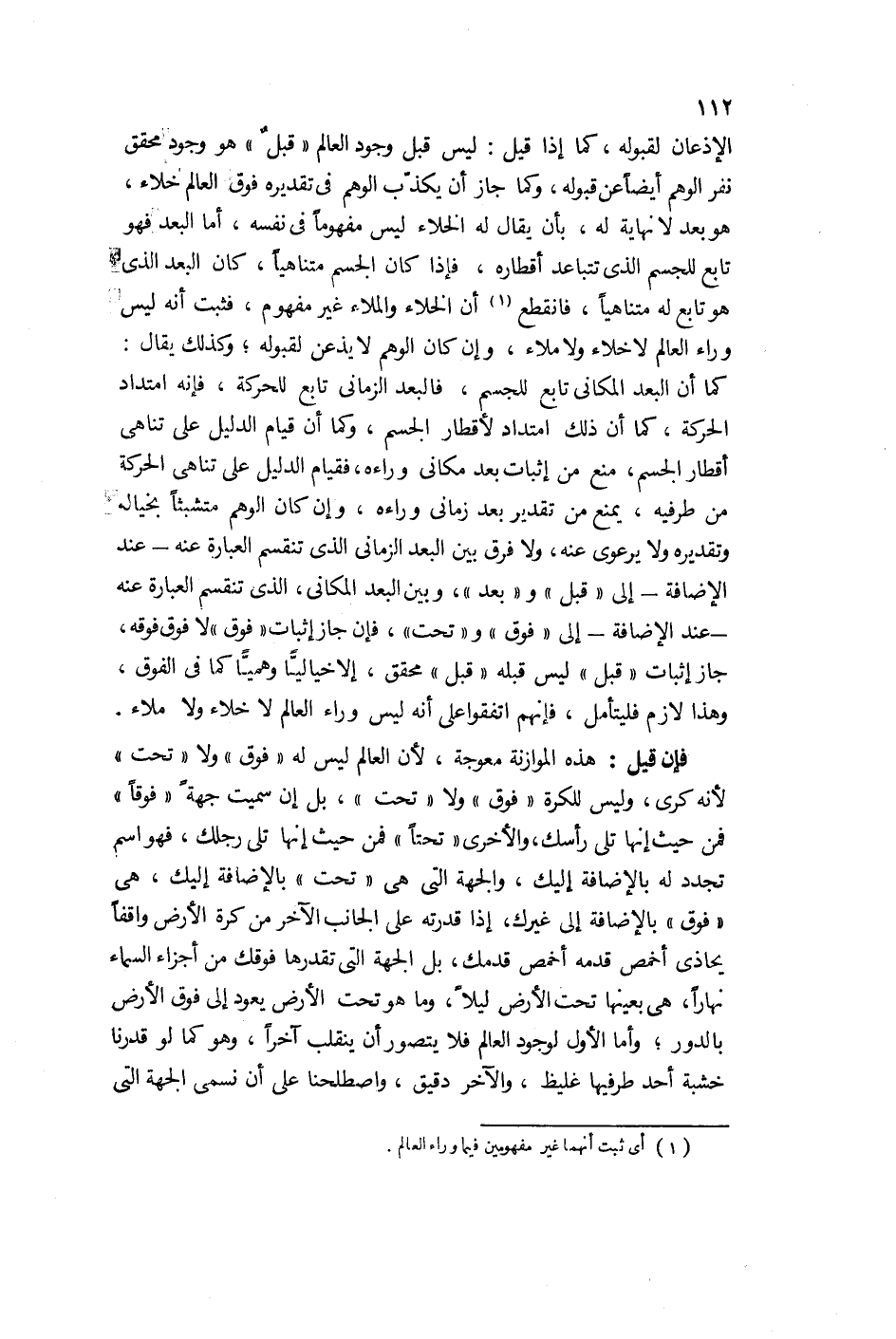 فكذلك يقال: كما أن البعد المكاني تابع للجسم فالبعد الزماني تابع للحركة، فإنه امتداد الحركة كما أن ذلك امتداد أقطار الجسم وكما أن قيام الدليل على تناهي أقطار الجسم منع من إثبات بعد مكاني وراءه. فقيام الدليل على تناهي الحركة من طرفيه يمنع من تقدير بعد زماني وراءه، وإن كان الوهم متشبثاً بخياله وتقديره ولا يرعوى عنه. ولا فرق بين البعد الزماني الذي تنقسم العبارة عنه عند الإضافة إلى "قبل" و "بعد" وبين البعد المكاني الذي تنقسم العبارة عنه عند الإضافة إلى فوق وتحت. فإن جاز إثبات "فوق" لا "فوق" فوقه جاز إثبات "قبل" ليس قبله "قبل" محقق، إلا خيال وهمي كما في الفوق. وهذا لازم فليتأمل، فإنهم اتفقوا على أنه ليس وراء العالم لا خلاء ولا ملاء.