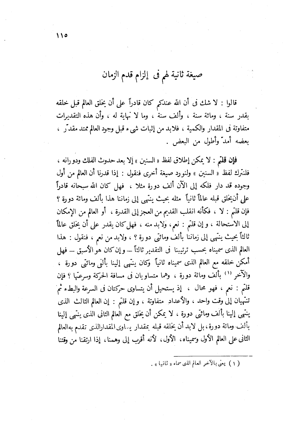 بحيث ينتهي إلى زماننا هذا بقدر عدد أكثر من الدورات وإن قلتم: لا يمكن إطلاق لفظ سنين إلا بعد حدوث الفلك ودوره فلنترك لفظ سنين ولنورد صيغة أخرى فنقول: إذا قدرنا أن العالم من أول وجوده قد دار فلكه إلى الآن بألف دورة مثلاً، فهل كان الله قادراً على أن يخلق قبله عالماً ثانياً مثله بحيث ينتهي إلى زماننا هذا بألف ومائة دورة؟ فإن قلتم: لا، فكأنه انقلب القديم من العجز إلى القدرة أو العالم من الاستحالة إلى الإمكان. وإن قلتم: نعم، ولا بد منه، فهل كان يقدر على أن يخلق عالماً ثالثاً بحيث ينتهي إلى زماننا بألف ومائتي دورة؟ ولا بد من نعم.