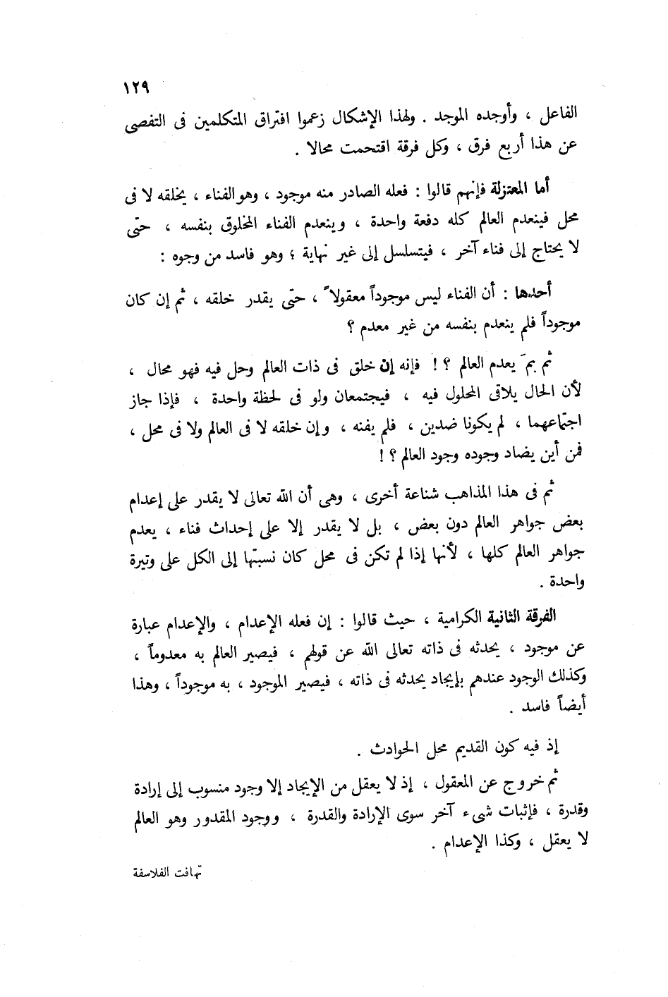 أما المعتزلة فإنهم قالوا: فعله الصادر منه موجود وهو الفناء، يخلقه لا في محل فينعدم كل العالم دفعة واحدة، وينعدم الفناء المخلوق بنفسه حتى لا يحتاج إلى فناء آخر، فيتسلسل إلى غير نهاية. وهو فاسد من وجوده أحدها أن الفناء ليس موجوداً معقولاً حتى يقدر خلقه، ثم إن كان موجوداً فلم ينعدم بنفسه من غير معدم، ثم لم يعدم العالم فإنه إن خلق في ذات العالم وحل فيه فهو محال لأن الحال يلاقي المحلول، فيجتمعان ولو في لحظة، فإذا جاز اجتماعهما لم يكن ضداً فلم يفنه. وإن خلقه لا في العالم ولا في محل فمن أين يضاد وجوده وجود العالم؟ ثم في هذا المذهب شناعة أخرى وهو أن الله لا يقدر على إعدام بعض جواهر العالم دون بعض، بل لا يقدر إلا على إحداث فناء يعدم العالم كله، لأنها إذا لم تكن في محل كان نسبتها إلى الكل على وتيرة.