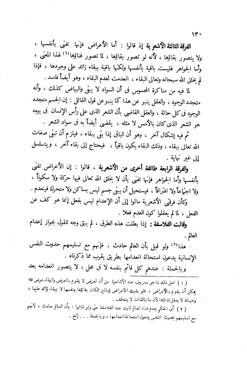 الفرقة الثالثة الأشعرية إذ قالوا: أما الأعراض فإنها تفنى بأنفسها ولا يتصور بقاءها، لأنه لو تصور بقاءها لما تصور فناؤها لهذا المعنى. وأما الجواهر فليست باقية بأنفسها ولكنها باقية ببقاء زائد على وجودها، فإذا لم يخلق الله البقاء انعدم لعدم المبقى. وهو أيضاً فاسد لما فيه من مناكرة المحسوس في أن السواد لا يبقى والبياض كذلك وأنه متجدد الوجود، والعقل ينبوا عن هذا كما ينبوا عن قول القائل: إن الجسم متجدد الوجود في كل حالة، والعقل القاضي بأن الشعر الذي على رأس الإنسان في يوم هو الشعر الذي كان بالأمس لا مثله يقضي أيضاً به في سواد الشعر. ثم فيه إشكال آخر وهو أن الباقي إذا بقي ببقاء فيلزم أن تبقى صفات الله ببقاء. وذلك البقاء يكون باقياً فيحتاج إلى بقاء آخر، ويتسلسل إلى غير نهاية.