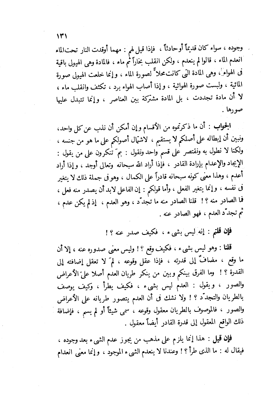 وجوده، سواء كان قديماً أو حادثاً. وإذا قيل لهم: مهما أغلي النار تحت الماء انعدم الماء، قالوا لم ينعدم ولكن انقلب بخاراً ثم ماء. فالمادة وهي الهيولى باقية في الهواء وهي المادة التي كانت لصورة الماء، وإنما خلعت، الهيولى صورة المائية ولبست صورة الهوائية. وإذا أصاب الهواء برد كثف وانقلب ماء، لا من مادة تجددت بل المواد مشتركة بين العناصر، وإنما يتبدل عليها صورها.