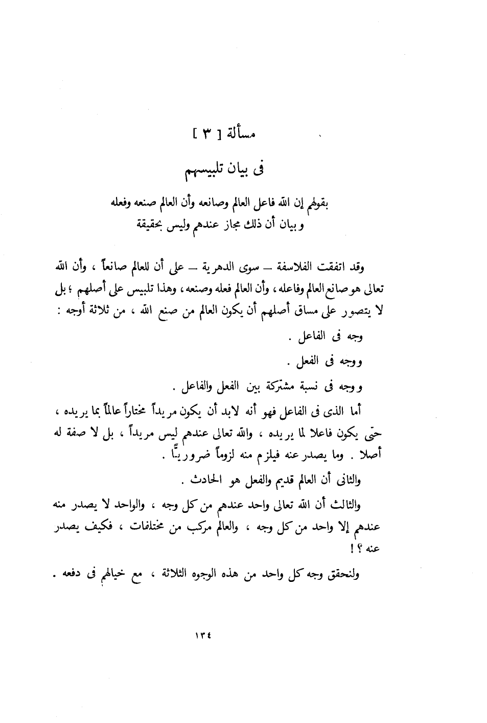 مسألة في بيان تلبيسهم بقولهم إن الله فاعل العالم وصانعه