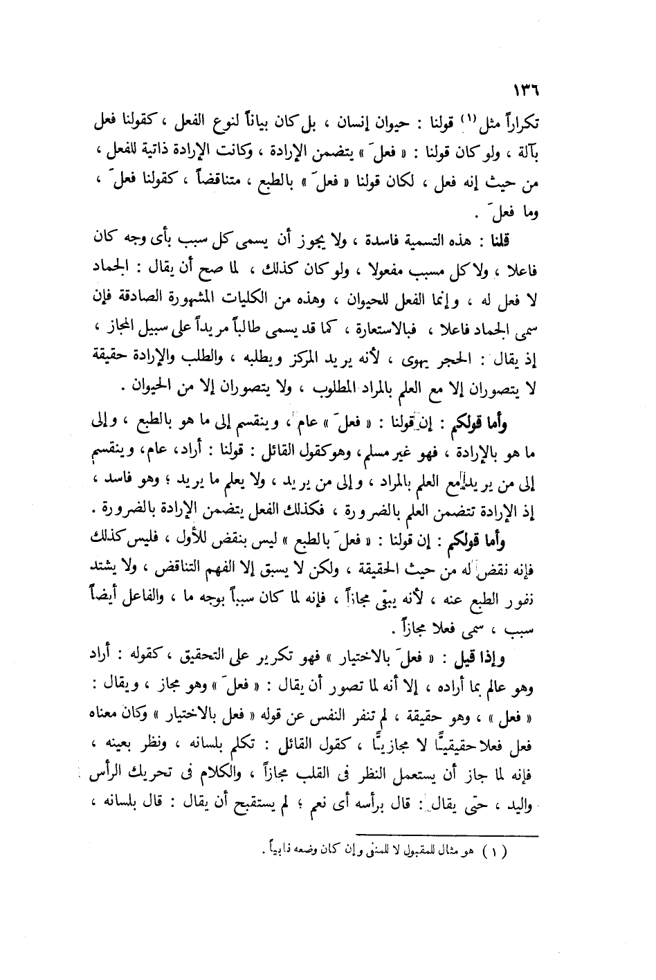 وأما قولكم: إن قولنا "فعل" عام وينقسم إلى ما هو بالطبع وإلى ما هو بالإرادة، غير مسلم وهو كقول القائل: قولنا "أراد" عام وينقسم إلى من يريد مع العلم بالمراد وإلى من يريد ولا يعلم ما يريد، وهو فاسد، إذ الإرادة تتضمن العلم بالضرورة، فكذلك الفعل يتضمن الإرادة بالضرورة.