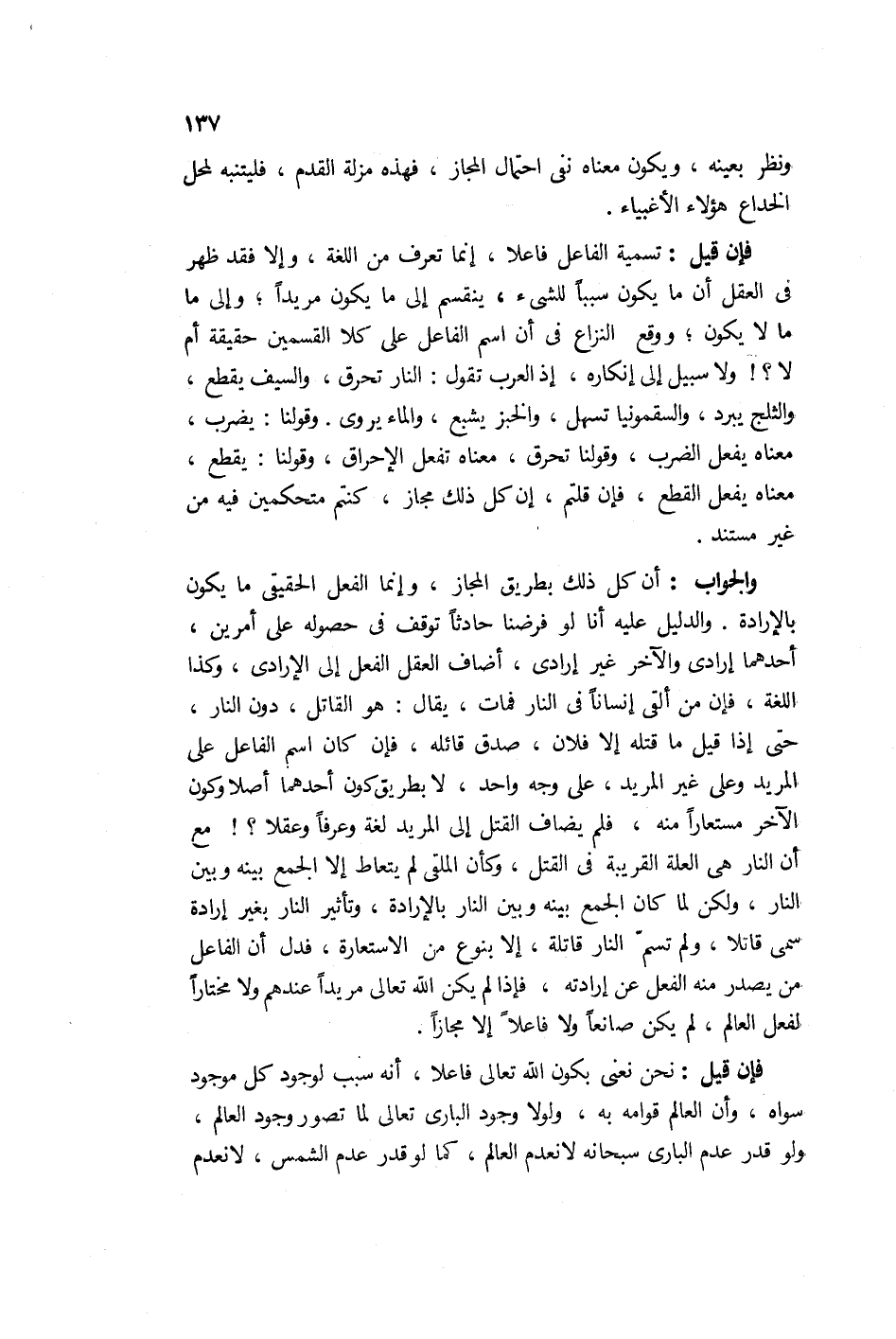 فإن كان اسم الفاعل على المريد وغير المريد على وجه واحد لا بطريق كون أحدهما أصلاً وكون الآخر مستعاراً منه، فلم يضاف القتل إلى المريد لغة وعرفاً وعقلاً؟ مع أن النار هي العلة القريبة في القتل، وكأن الملقى لم يتعاط إلا الجمع بينه وبين النار. ولكن لما أن كان الجمع بالإرادة وتأثير النار بغير إرادة سمي قاتلاً ولم تسم النار قاتلاً إلا بنوع من الاستعارة. فدل أن الفاعل من صدر الفعل عن إرادته، وإذا لم يكن الله مريداً عندهم ولا مختاراً لفعل لم يكن صانعاً ولا فاعلاً إلا مجازاً.
