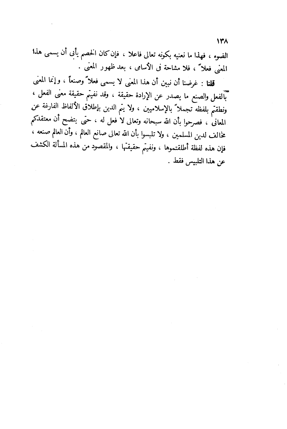 قلنا: غرضنا أن نبين أن هذا المعنى لا يسمى فعلاً وصنعاً، وإنما المعنى بالفعل والصنع ما يصدر عن الإرادة حقيقية. وقد نفيتم حقيقة معنى الفعل ونطقتم بلفظه تجملاً بالإسلاميين، ولا يتم الدين بإطلاق الألفاظ الفارغة عن المعاني. فصرحوا بأن الله لا فعل له، حتى يتضح أن معتقدكم مخالف لدين المسلمين. ولا تلبسوا بأن الله صانع العالم وأن العالم صنعه فإن هذه لفظة أطلقتموها ونفيتم حقيقتها، ومقصود هذه المسألة الكشف عن هذا التلبيس فقط.