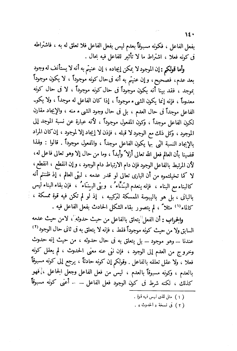 والجواب: إن الفعل يتعلق بالفاعل من حيث حدوثه لا من حيث عدمه السابق ولا من حيث كونه موجوداً فقط، فإنه لا يتعلق به في ثاني حال الحدوث عندنا وهو موجود، بل يتعلق به في حال حدوثه من حيث أنه حدوث وخروج من العدم إلى الوجود، فإن نفى منه معنى الحدوث لم يعقل كونه فعلاً ولا تعلقه بالفاعل.