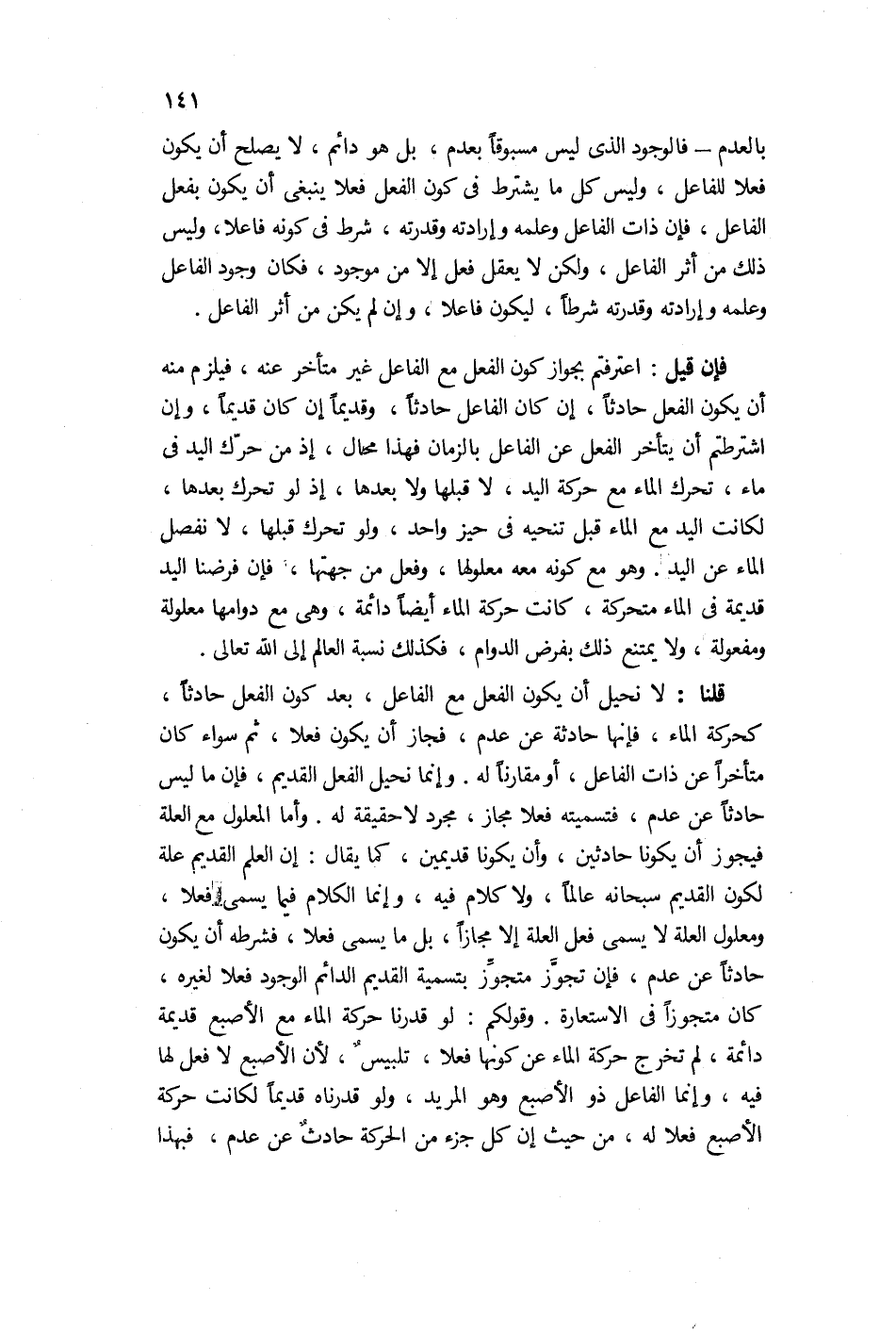 فإن قيل: إن اعترفتم بجواز كون الفعل مع الفاعل غير متأخر عنه، فيلزم أن يكون الفعل حادثاً إن كان الفاعل حادثاً، وقديماً إن كان قديماً. وإن شرطتم أن يتأخر الفعل عن الفاعل بالزمان، فهذا محال إذ من حرك اليد في قدح ماء تحرك الماء مع حركة اليد لا قبله ولا بعده، إذ لو تحرك بعده لكان اليد مع الماء قبل تنحيه في حيز واحد، ولو، تحرك قبله لانفصل الماء عن اليد، وهو مع كونه معه معلوله وفعل من جهته. فإن فرضنا اليد قديمة في الماء متحركة كانت حركة الماء أيضاً دائمة وهي مع دوامها معلولة ومفعولة. ولا يمتنع ذلك بفرض الدوام، فكذلك نسبة العالم إلى الله.
