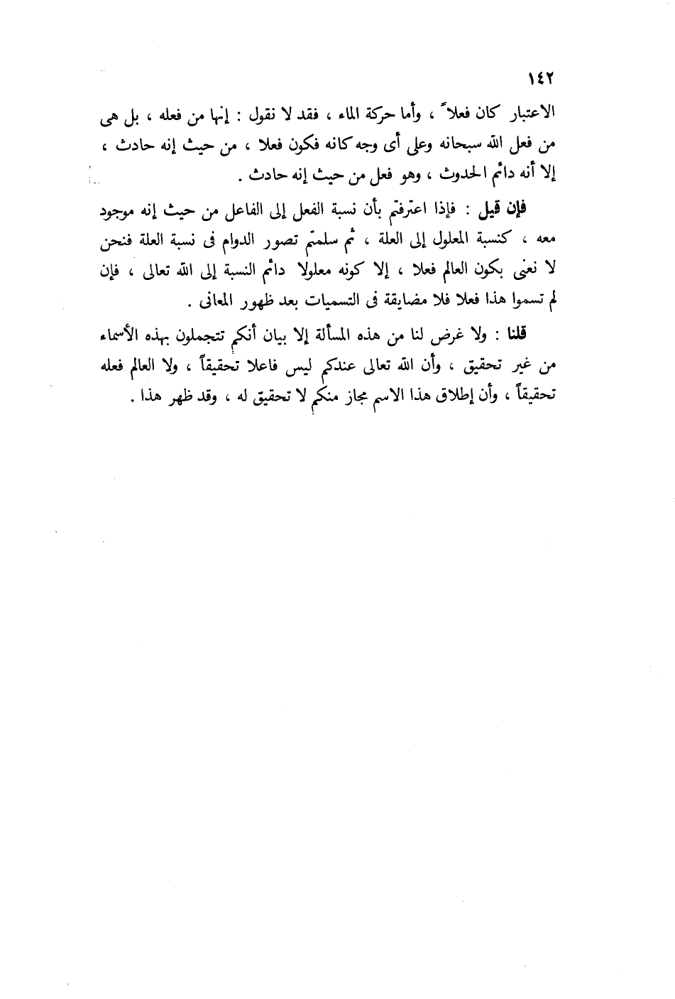 فإن قيل: فإذا اعترفتم بأن نسبة الفعل إلى الفاعل من حيث أنه موجود كنسبة المعلول إلى العلة ثم سلمتم تصور الدوام في نسبة العلة، فنحن لا نعني بكون العالم فعلاً إلا كونه معلولاً دائم النسبة إلى الله تعالى فإن لم تسموا هذا فعلاً فلا مضايقة في التسميات بعد ظهور المعاني.
