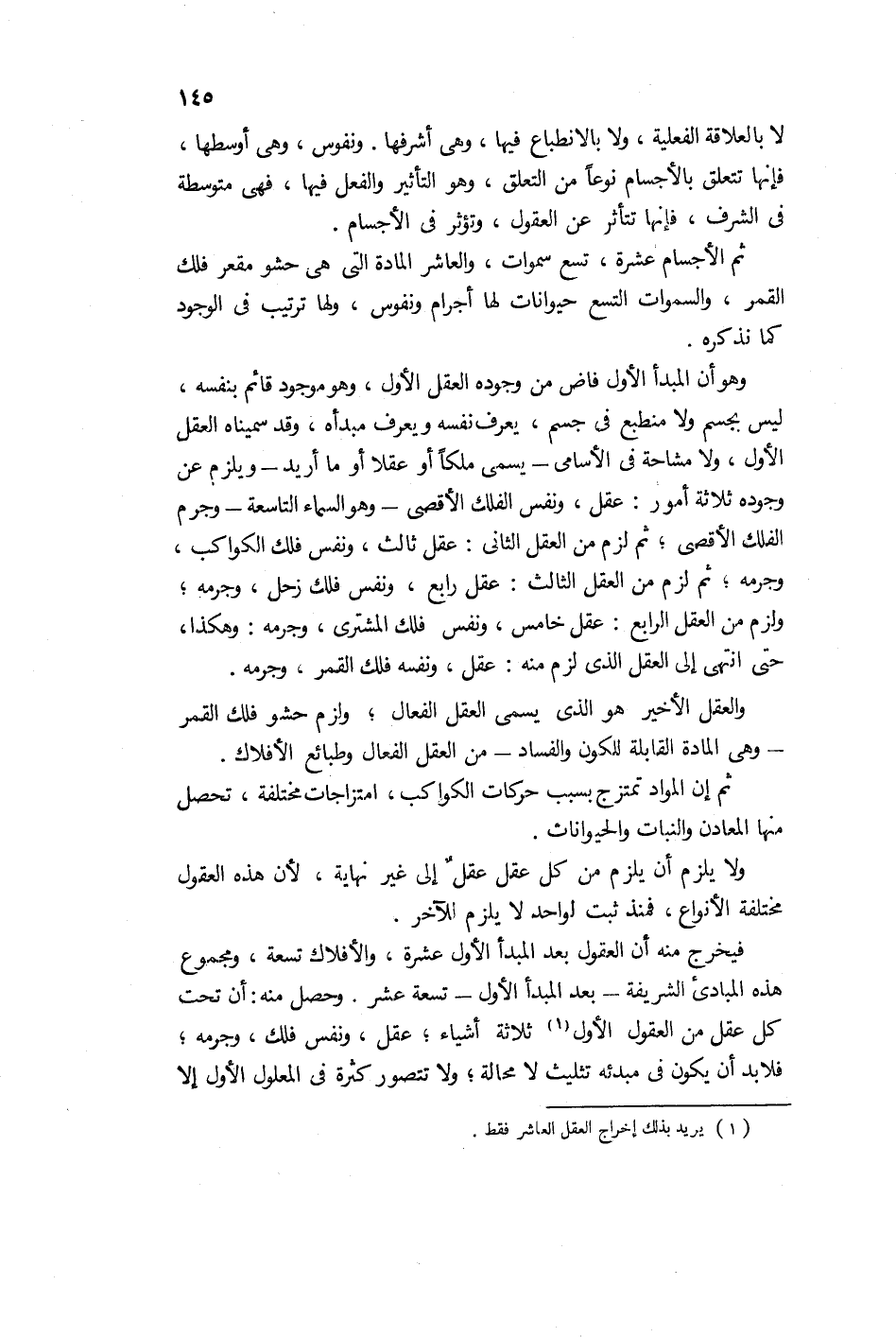 والعقل الأخير هو الذي يسمى العقل الفعال، ولزم حشو فلك القمر وهي المادة القابلة للكون والفساد من العقل الفعال وطبائع الأفلاك.