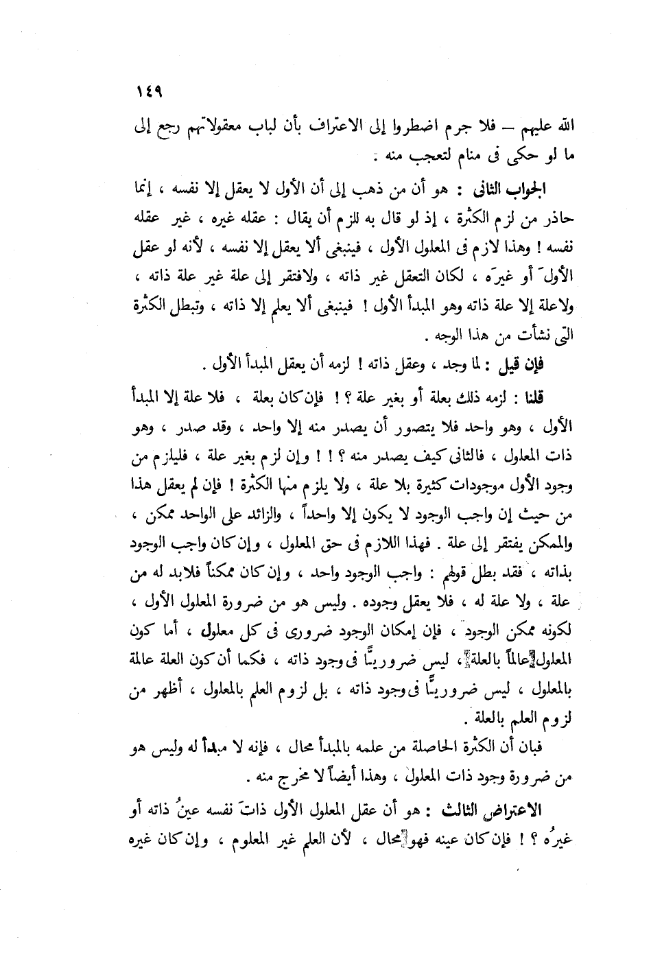 وليس هو من ضرورة المعلول الأول لكونه ممكن الوجود فإن إمكان الوجود ضروري في كل معلول. أما كون المعلول عالماً بالعلة ليس ضرورياً في وجود ذاته كما أن كون العلة عالماً بالمعلول ليس ضرورياً في وجود ذاته. بل لزوم العلم بالمعلول أظهر من لزوم العلم بالعلة، فبان أن الكثرة الحاصلة من علمه بالمبدأ محال فإنه لا مبدأ له وليس هو من ضرورة وجود ذات المعلول، وهذا أيضاً لا مخرج منه.