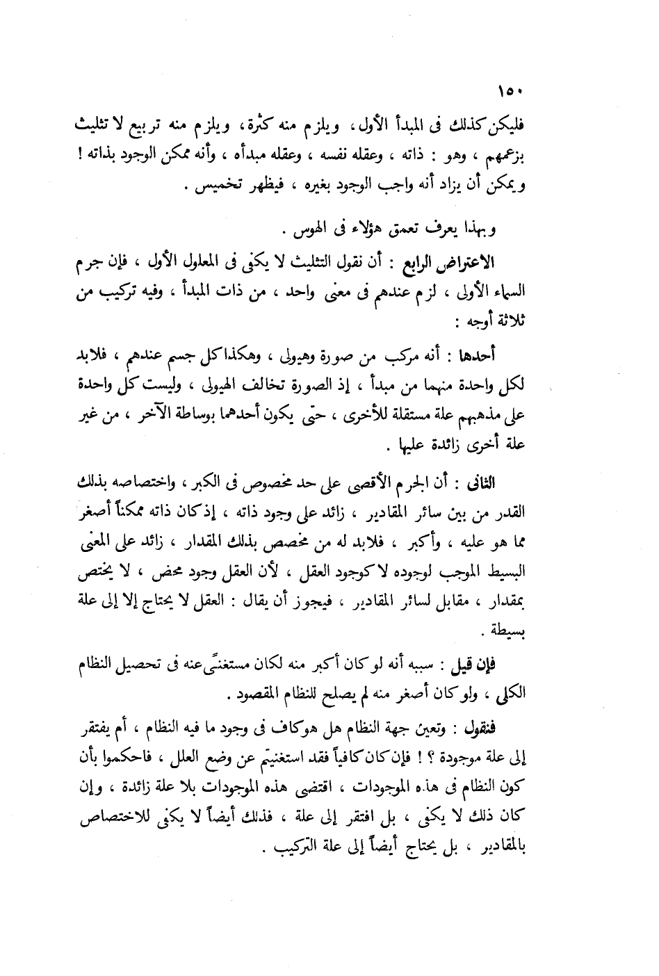 التثيلث لا يكفي في جرم السماء الأول الاعتراض الرابع أن نقول: التثليث لا يكفي في المعلول الأول فإن جرم السماء الأول لزم عندهم من معنى واحد من ذات المبدأ وفيه تركيب من ثلاثة أوجه: لا بد له من صورة وهيولى أحدها أنه مركب من صورة وهيولى وهكذى كل جسم عندهم. فلا بد لكل واحد من مبدأ إذ الصورة تخالف الهيولى. وليست كل واحدة على مذهبهم علة مستقلة للأخرى حتى يكون أحدهما بواسطة الآخر من غير علة أخرى زائدة عليه.