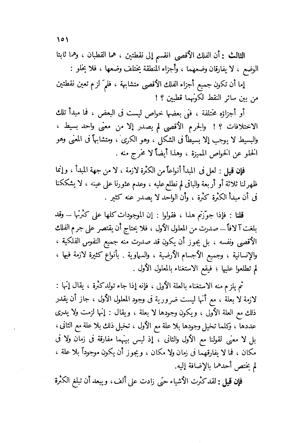 قولهم لعل في المبدأ أنواعاً من الكثرة لازمة لا من جهة المبدأ فإن قيل: لعل في المبدأ أنواعاً من الكثرة لازمة لا من جهة المبدأ، وإنما ظهر لنا ثلاثة أو أربعة والباقي لم نطلع عليه، وعدم عثورنا على عينه لا يشككنا في أن مبدأ الكثرة كثرة وأن الواحد لا يصدر منه كثير.