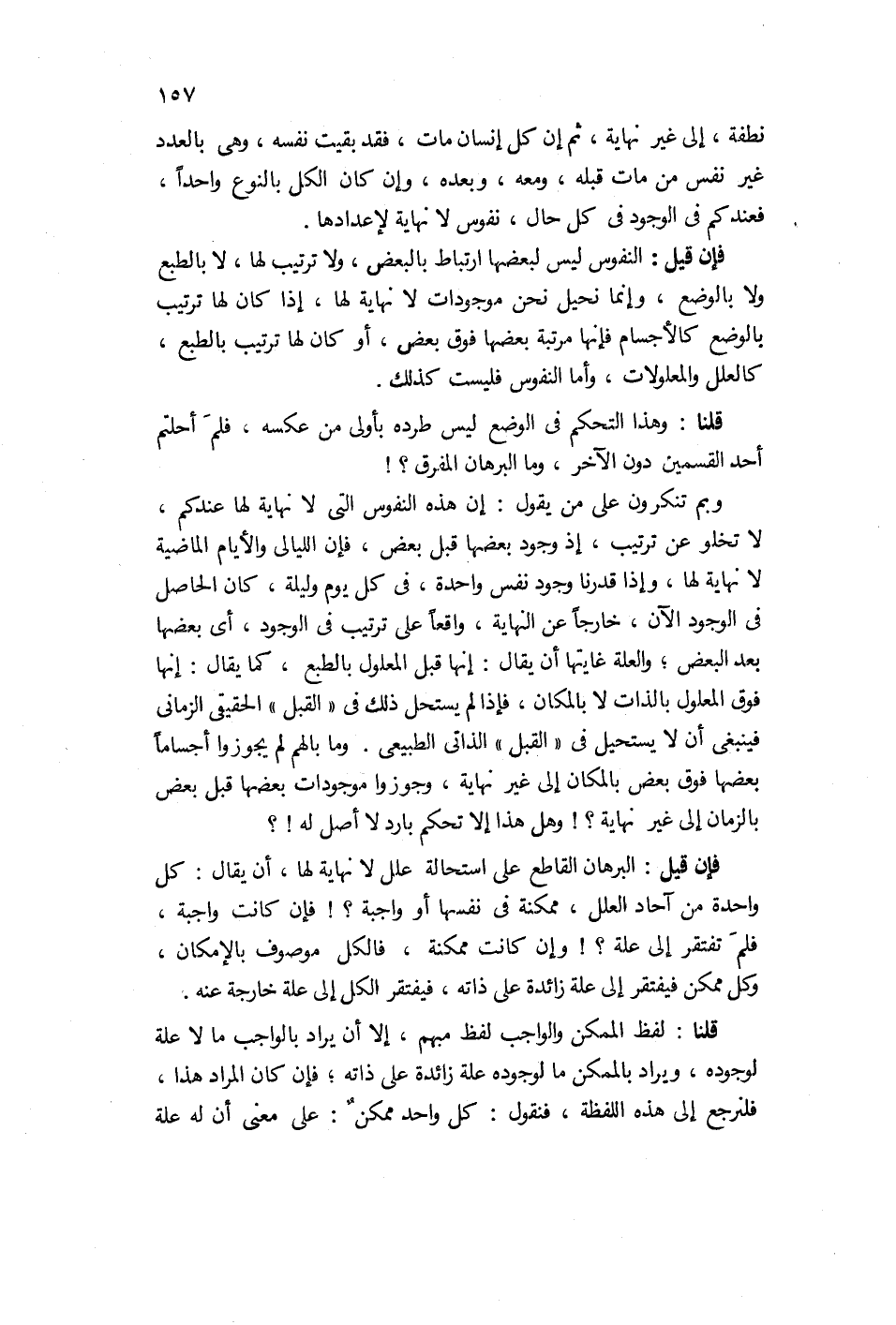 قلنا: وهذا الحكم في الوضع ليس طرده بأولى من عكسه، فلم أحلتم أحد القسمين دون الآخر؟ وما البرهان المفرق؟ وبم تنكرون على من يقول: إن هذه النفوس التي لا نهاية لها لا تخلوا عن ترتيب إذ وجود بعضها قبل البعض؟ فإن الأيام والليالي الماضية لا نهاية لها. وإذا قدرنا وجود نفس واحد في كل يوم وليلة كان الحاصل في الوجود الآن خارجاً عن النهاية واقعاً على ترتيب في الوجود أي بعضها بعد البعض. والعلة غايتها أن يقال: إنها قبل المعلول بالطبع كما يقال إنها فوق المعلول بالذات لا بالمكان. فإذا لم يستحل ذلك في القبل الحقيقي الزماني فينبغي أن لا يستحيل في القبل الذاتي الطبعي. وما بالهم لم يجوزوا أجساماً بعضها فوق البعض بالمكان إلى غير نهاية وجوزوا موجودات بعضها قبل البعض بالزمان إلى غير نهاية؟ وهل هذا إلا تحكم بارد لا أصل له؟