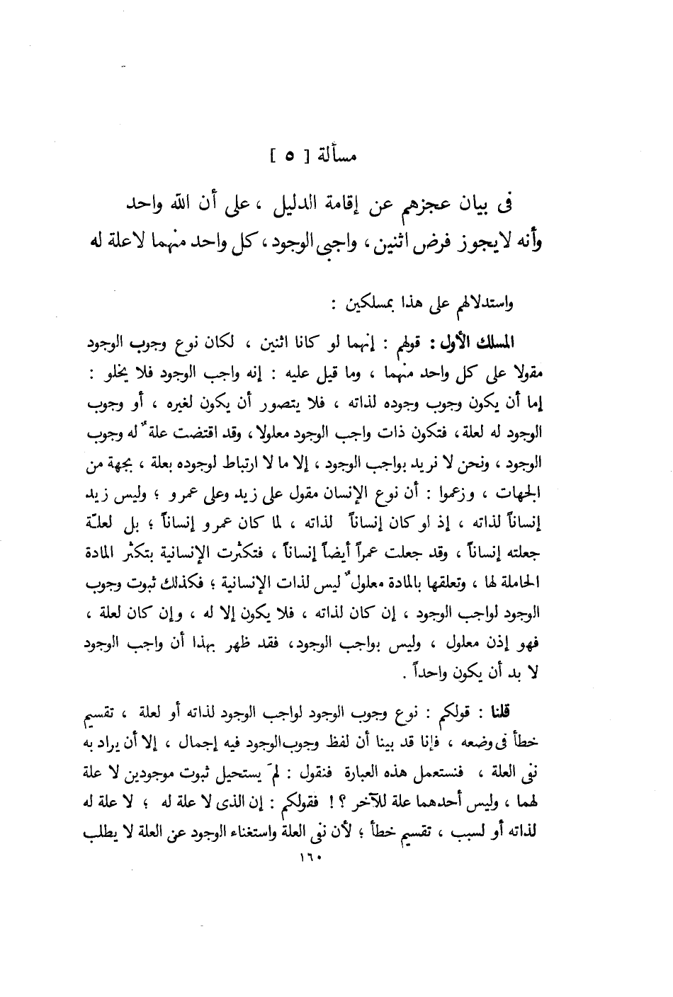 المسلك الأول قولهم: إنهما لو كانا اثنين لكان نوع وجوب الوجود مقولاً على كل واحد منهما. وما قيل عليه أنه واجب الوجود فلا يخلوا إما أن يكون وجوب وجوده لذاته فلا يتصور أن يكون لغيره، أو وجوب الوجود له لعلة فيكون ذات واجب الوجود معلولاً، وقد اقتضت علة له وجوب الوجود. ونحن لا نريد بواجب الوجود إلا ما لا ارتباط لوجوده بعلة بجهة من الجهات.