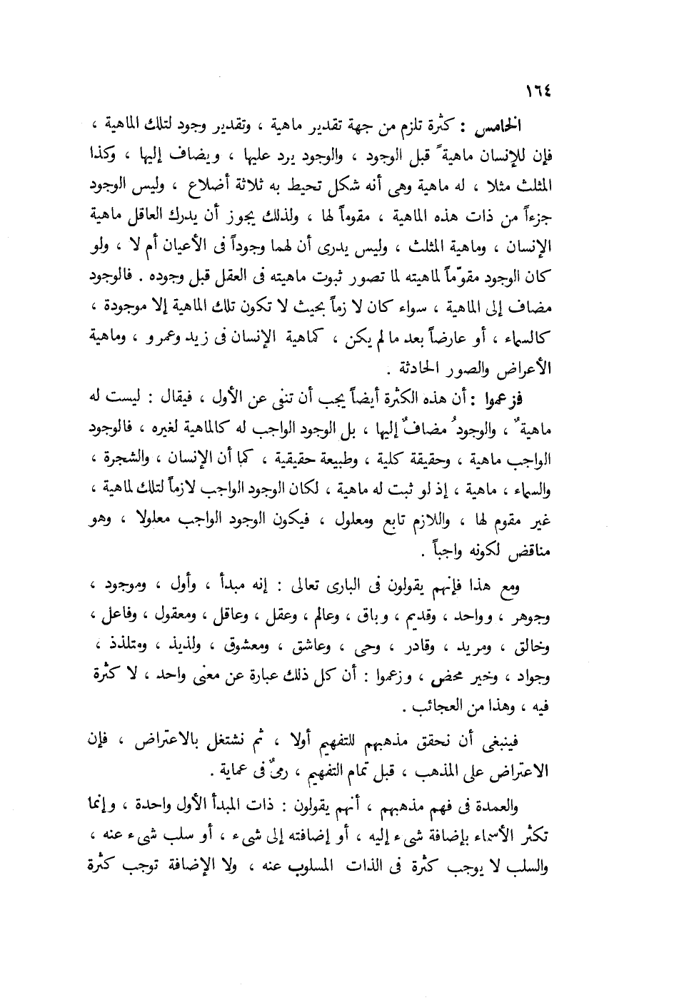 والخامس كثرة تلزم من جهة تقدير ماهية وتقدير وجود لتلك الماهية. فإن للإنسان ماهية قبل الوجود، والوجود يرد عليها ويضاف إليها. وكذى المثلث مثلاً له ماهية وهو أنه شكل يحيط به ثلاثة أضلاع، وليس الوجود جزءاً من ذات هذه الماهية مقوماً لها، ولذلك يجوز أن يدرك العاقل ماهية الإنسان وماهية المثلث، وليس يدري أن لهما وجوداً في الأعيان أم لا. ولو كان الوجود مقوماً لماهيته لما تصور ثبوت ماهيته في العقل قبل وجوده. فالوجود مضاف إلى الماهية سواء كان لازماً بحيث لا تكون تلك الماهية إلا موجودة كالسماء، أو عارضاً بعد ما لم يكن كماهية الإنسانية من زيد وعمرو وماهية الأعراض الصور الحادثة. فزعموا أن هذه الكثرة أيضاً يجب أن تنفى عن الأول.