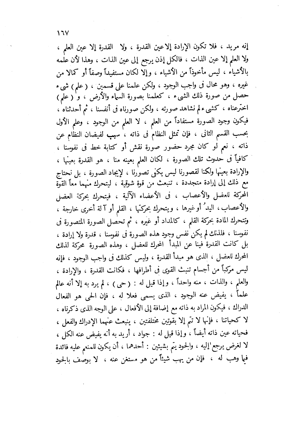 نعم لو كان مجرد حضور صورة نقش أو كتابة خط في نفوسنا كافياً في حدوث تلك الصورة، لكان العلم بعينه منا هو القدرة بعينها والإرادة بعينها. ولكنا لقصورنا فليس يكفي تصورنا لإيجاد الصورة، بل نحتاج مع ذلك إلى إرادة متجددة تنبعث من قوة شوقية ليتحرك منهما معاً القوة المحركة للعضل والأعصاب الآلية. فيتحرك بحركة العضل والأعصاب اليد أو غيره، ويتحرك بحركته القلم أو آلة أخرى خارجة، وتتحرك المادة بحركة القلم كالمادة أو غيره ثم تحصل الصورة المتصورة في نفوسنا. فلذلك لم يكن نفس وجود هذه الصورة في نفوسنا قدرة ولا إرادة بل كانت القدرة فينا عند المبدأ المحرك للعضل، وهذه الصورة محركة لذلك المحرك الذي هو مبدأ القدرة، وليس كذلك في واجب الوجود فإنه ليس مركباً من أجسام تنبث القوى في أطرافه، فكانت القدرة والإرادة والعلم والذات منه واحداً.