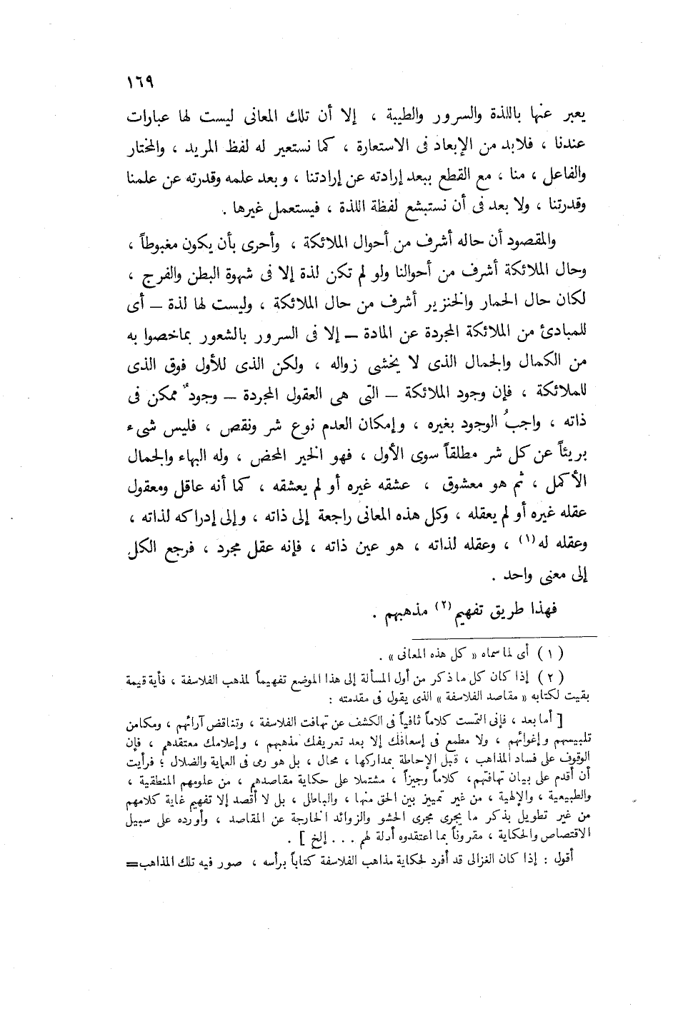 والمقصود أن حالته أشرف من أحوال الملائكة وأحرى بأن يكون مغبوطاً، وحالة الملائكة أشرف من أحوالنا، ولو لم تكن لذة إلا في شهوة البطن والفرج لكان حال الحمار والخنزير أشرف من حال الملائكة وليس لها لذة، أي للمبادئ من الملائكة المجردة عن المادة، إلا السرور بالشعور بما خص بها من الكمال والجمال الذي لا يخشى زواله. ولكن الذي للأول فوق الذي للملائكة، فإن وجود الملائكة التي هي العقول المجردة وجود ممكن في ذاته واجب الوجود بغيره، وإمكان العدم نوع شر ونقص، فليس شيء بريئاً عن كل شر مطلقاً سوى الأول فهو الخير المحض وله البهاء والجمال الأكمل. ثم هو معشوق عشقه غيره أو لم يعشقه كما أنه عاقل ومعقول عقله غيره أو لم يعقله. وكل هذه المعاني راجعة إلى ذاته وإلى إدراكه لذاته وعقله له، وعقله لذاته هو عين ذاته فإنه عقل مجرد، فيرجع الكل إلى معنى واحد.