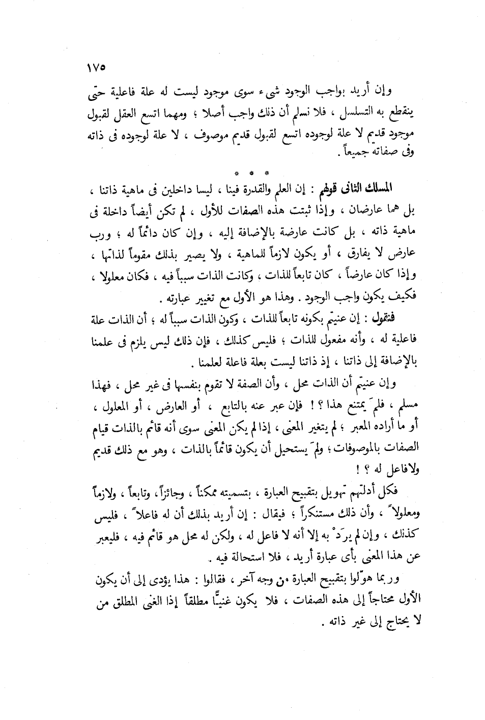 المسلك الثاني قولهم: إن العلم والقدرة فينا ليس داخلاً في ماهية ذاتنا بل هو عارض. وإذا أثبت هذه الصفات للأول لم يكن أيضاً داخلاً في ماهية ذاته بل كان عارضاً بالإضافة إليه وإن كان دائماً له. ورب عارض لا يفارق أو يكون لازماً لماهية ولا يصير بذلك مقوماً لذاته. وإذا كان عارضاً كان تابعاً للذات وكان الذات سبباً فيه فكان معلولاً، فكيف يكون واجب الوجود؟