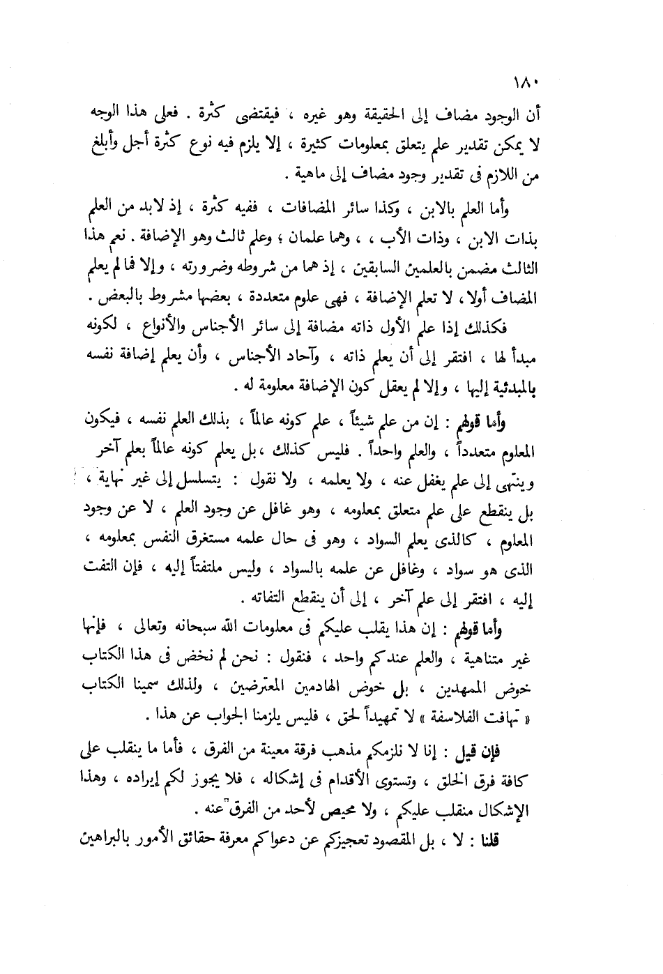 ... وأما الثالث، فعليكم البرهان وأما قولهم: إن هذا ينقلب عليكم في معلومات الله فإنها غير متناهية والعلم عندكم واحد، فنقول: نحن لم نخض في هذا الكتاب خوض الممهدين بل خوض الهادمين المعترضين ولذلك سمينا الكتاب: تهافت الفلاسفة، لا تمهيد الحق. فليس يلزمنا هذا الجواب.