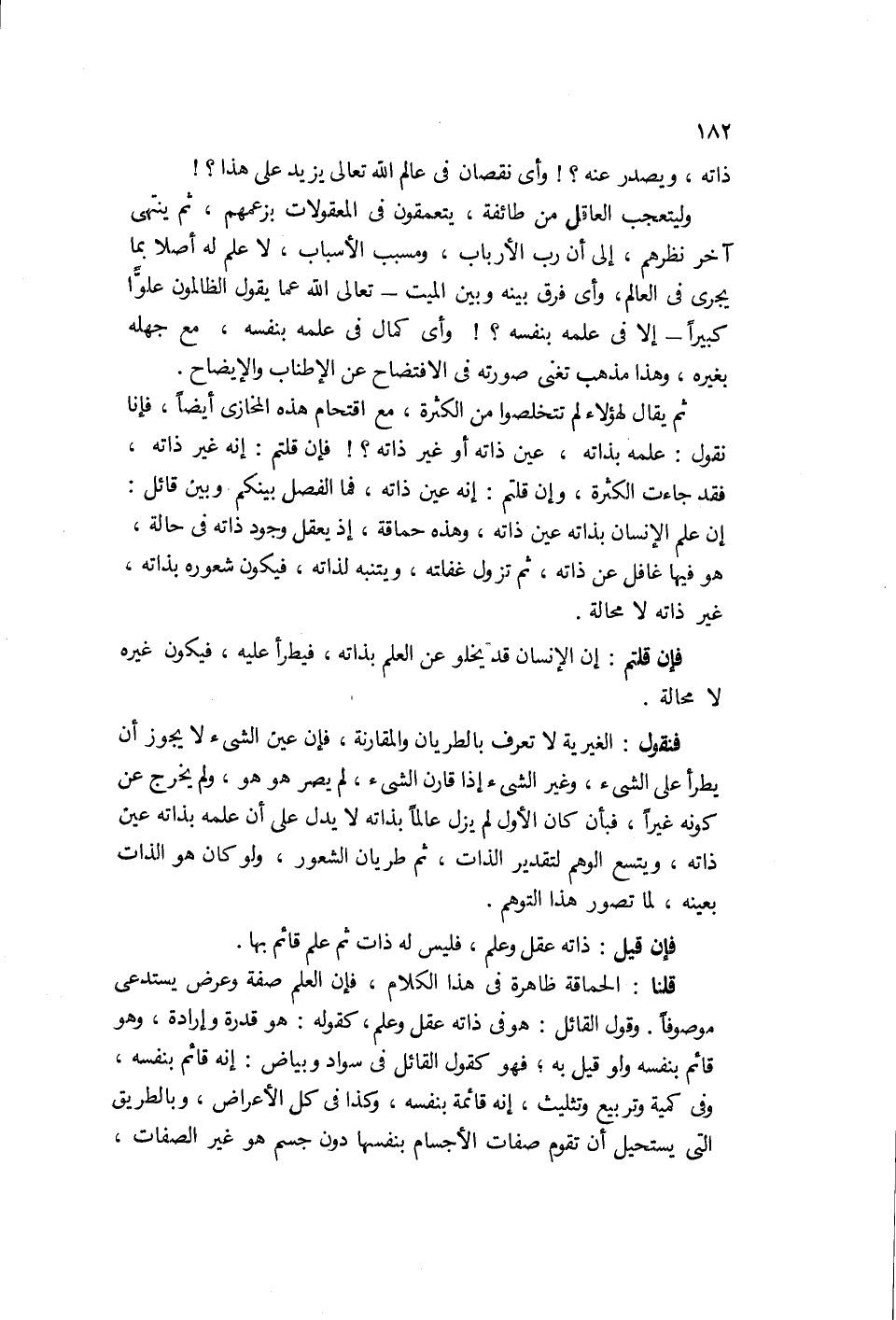 الذات غير العلم بالذات، كما في الإنسان ثم يقال لهؤلاء: لم تتخلصوا عن الكثرة مع اقتحام هذه المخازي أيضاً، فإنا نقول: علمه بذاته عين ذاته أو غير ذاته. فإن قلتم: إنه غيره، فقد جاءت الكثرة، وإن قلتم: إنه عينه، فما الفصل بينكم وبين قائل: إن علم الإنسان بذاته عين ذاته؟ وهو حماقة إذ يعقل وجود ذاته في حالة هو فيها غافل عن ذاته ثم تزول غفلته ويتنبه لذاته فيكون شعوره بذاته غير ذاته لا محالة.