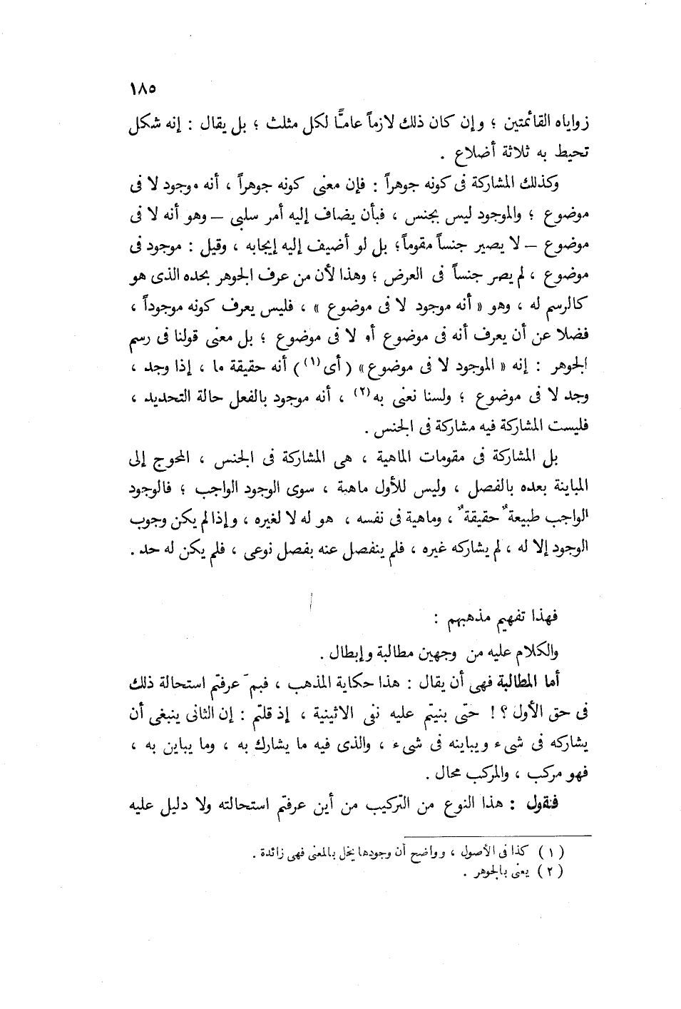 ... بل الوجود الواجب هو للأول لا لغيره بل المشاركة في مقومات الماهية هي المشاركة في الجنس المحوج إلى المباينة بعده بالفصل وليس للأول ماهية سوى الوجود الواجب. فالوجود الواجب طبيعة حقيقية وماهية في نفسه هو له لا لغيره. وإذا لم يكن وجوب الوجود إلا له لم يشارك غيره فلم ينفصل عنه بفصل نوعي، فلم يكن له حد.