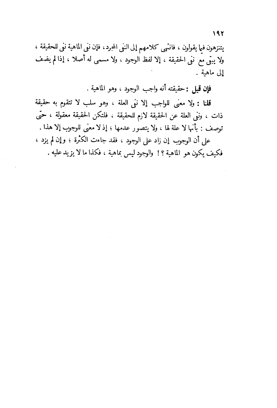 قلنا: ولا معنى للواجب إلا نفي العلة وهو سلب لا يتقوم به حقيقة ذات، ونفي العلة عن الحقيقة لازم الحقيقة، فلتكن الحقيقة معقولة حتى توصف بأنه لا علة لها ولا يتصور عدمها إذ لا معنى للوجوب إلا هذا. على أن الوجوب إن زاد على الوجود فقد جاءت الكثرة، وإن لم يزد فكيف يكون هو الماهية والوجود ليس بماهية؟ فكذى ما لا يزيد عليه.
