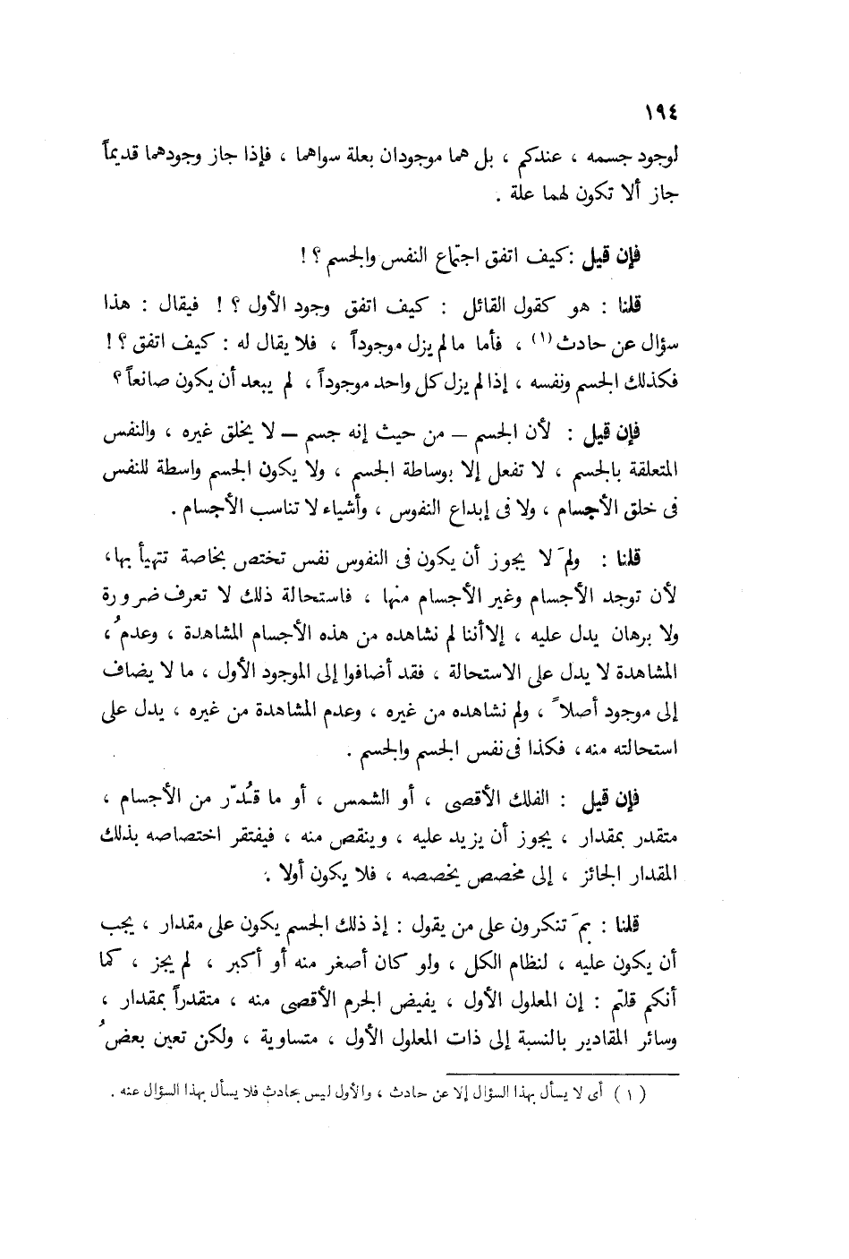 قلنا: ولم لا يجوز أن يكون في النفوس نفس تختص بخاصية تتهيأ بها لأن توجد الأجسام وغير الأجسام منها؟ فاستحالة ذلك لا يعرف ضرورة ولا برهان يدل عليه، إلا أنه لم نشاهد من هذه الأجسام المشاهدة وعدم المشاهدة لا يدل على الاستحالة فقد أضافوا إلى الموجود الأول بما لا يضاف إلى موجود أصلاً، ولم نشاهد من غيره وعدم المشاهدة من غيره لا يدل على استحالته منه فكذى في نفس الجسم والجسم.