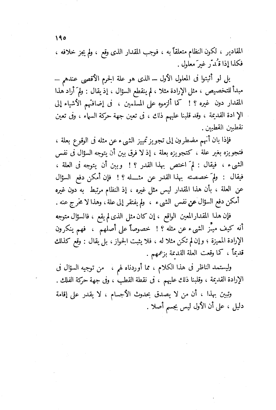وليستمد الناظر في هذا الكلام مما أوردناه لهم من توجيه السؤال في الإرادة القديمة وقلبنا ذلك عليهم في نقطة القطب وجهة حركة الفلك.