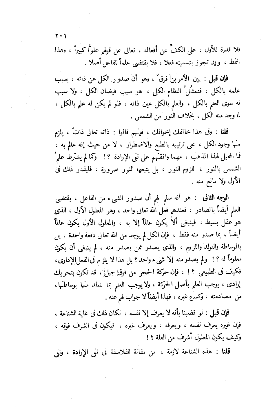 الوجه الثاني هو أنه إن سلم أن صدور الشيء من الفاعل يقتضي العلم أيضاً بالصادر فعندهم فعل الله واحد وهو المعلول الأول الذي هو عقل بسيط فينبغي أن لا يكون عالماً إلا به، والمعلول الأول يكون عالماً أيضاً بما صدر منه فقط فإن الكل لم يوجد من الله دفعة بل بالوساطة والتولد واللزوم، فالذي يصدر مما يصدر منه لم ينبغي أن يكون معلوماً له ولم يصدر منه إلا شيء واحد؟ بل هذا لا يلزم في الفعل الإرادي فكيف في الطبيعي؟ فإن حركة الحجر من فوق جبل قد يكون بتحريك إرادي يوجب العلم بأصل الحركة ولا يوجب العلم بما يتولد منه بوساطته من مصادمته وكسره غيره. فهذا أيضاً لا جواب له عنه.
