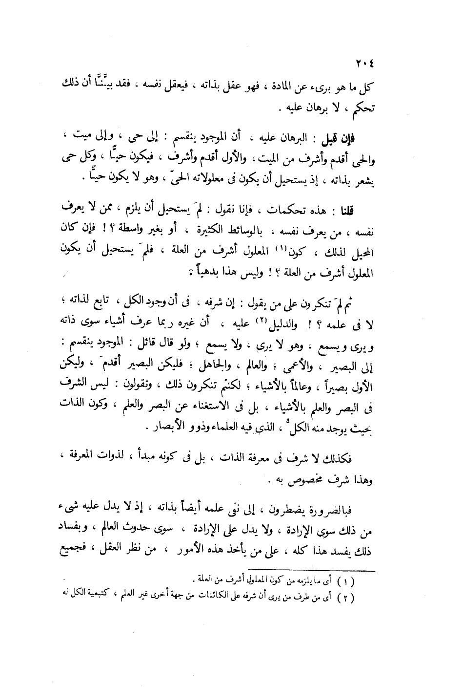ثم بم تنكرون أن شرفه في أن وجود الكل تابع لذاته لا في علمه؟ الدليل عليه أن غيره ربما عرف أشياء سوى ذاته ويرى ويسمع وهو لا يرى ولا يسمع. ولو قال قائل: الموجود ينقسم إلى البصير والأعمى والعالم والجاهل، فليكن البصير أقدم وليكن الأول بصيراً وعالماً بالأشياء. لكنكم تنكرون ذلك وتقولون: ليس الشرف في البصر والعلم بالأشياء بل في الاستغناء عن البصر والعلم وكون الذات بحيث يوجد منه الكل فيه العلماء وذوو الأبصار. فكذلك لا شرف في معرفة الذات بل في كونه مبدأ لذوات المعرفة وهذا شرف مخصوص به.