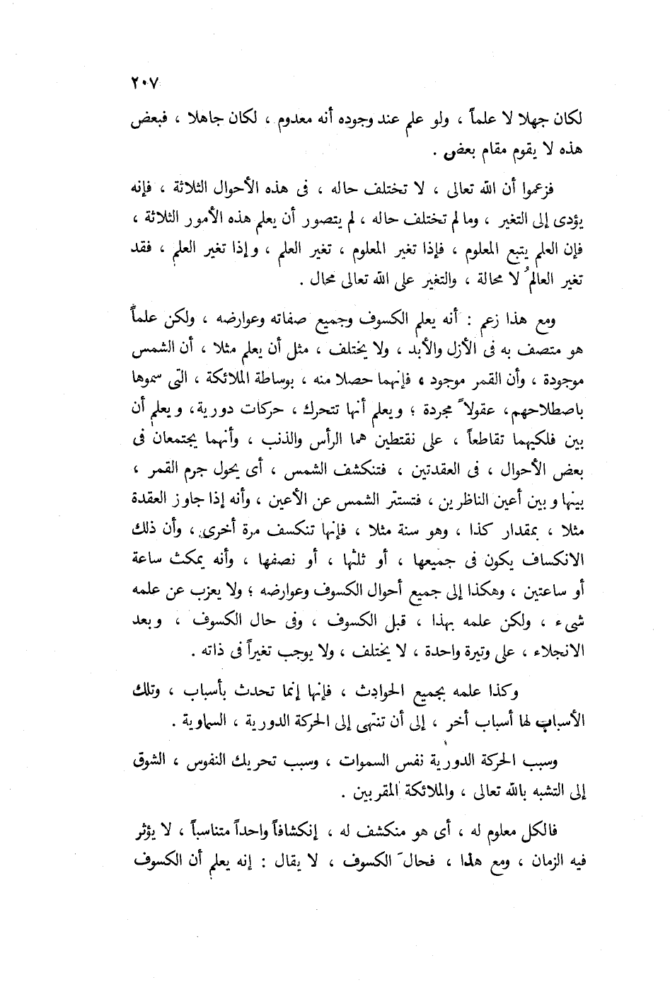 فهو يعلم الخواص ولا يعلم عوارضها ... وكذى مذهبهم فيما ينقسم بالمادة والمكان كأشخاص الناس والحيوانات فإنهم يقولون: لا يعلم عوارض زيد وعمرو وخالد وإنما يعلم الإنسان المطلق بعلم كلي ويعلم عوارضه وخواصه، وأنه ينبغي أن يكون بدنه مركباً من أعضاء بعضها للبطش وبعضها للمشي وبعضها للإدراك وبعضها زوج وبعضها فرد، وأن قواه ينبغي أن تكون مبثوثة في أجزائه، وهلم جرا إلى كل صفة في داخل الآدمي وباطنه وكل ما هو من لواحقه وصفاته ولوازمه حتى لا يعزب عن علمه شيء ويعلمه كلياً.