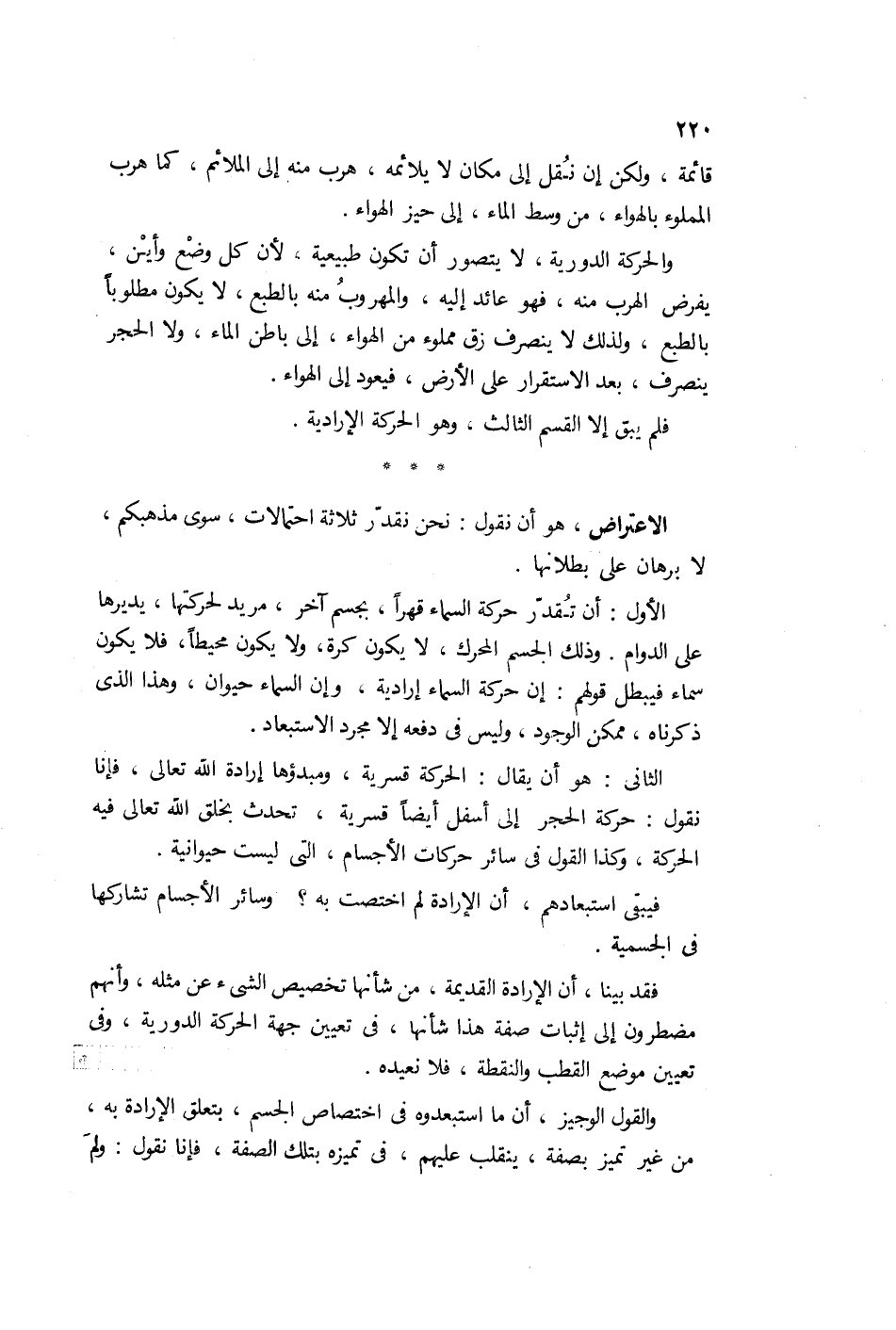 أن تكون حركة السماء بجسم غير سماوي الاعتراض هو أنا نقول: نحن نقرر ثلث احتمالات سوى مذهبكم لا برهان على بطلانها.