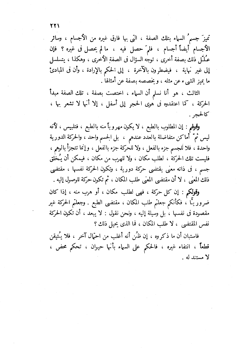 أو تكون بالطبع وبدون أن تشعر لا لطلب المكان ولا للهرب منه الثالث هو أن يسلم أن السماء اختص بصفة تلك الصفة مبدأ الحركة كما اعتقدوه في هوى الحجر إلى أسفل إلا أنه لا يشعر به كالحجر. وقولهم: إن المطلوب بالطبع لا يكون مهروباً عنه بالطبع، فتلبيس لأنه ليس ثم أماكن متفاصلة بالعدد عندهم بل الجسم واحد والحركة الدورية واحدة فلا للجسم جزء بالفعل ولا للحركة جزء بالفعل وإنما يتجزى بالوهم، فليست تلك الحركة لطلب المكان ولا للهرب من المكان. فيمكن أن يخلق جسم وفي ذاته معنى يقتضي حركة دورية وتكون الحركة نفسها مقتضى ذلك المعنى لا أن مقتضى المعنى طلب المكان، ثم تكون حركة للوصول إليه.