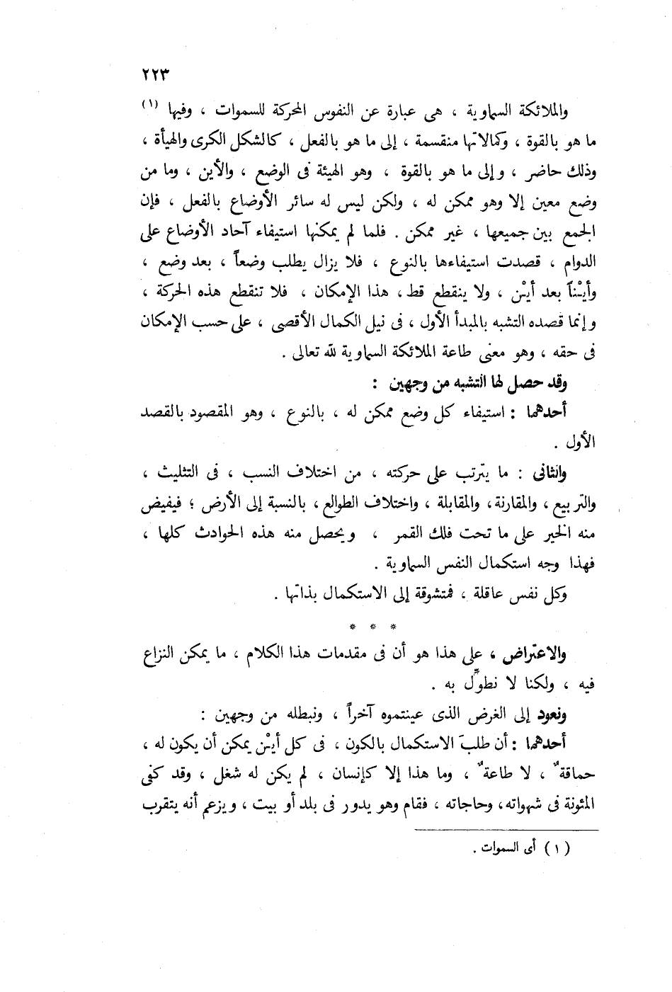 وقد حصل لها التشبه من وجهين: أحدهما استيفاء كل وضع ممكن له بالنوع وهو المقصود بالقصد الأول. والثاني ما يترتب على حركته من اختلاف النسب في التثليث والتربيع والمقارنة والمقابلة واختلاف الطوالع بالنسبة إلى الأرض فيفيض منه الخير على ما تحت فلك القمر ويحصل منه هذه الحوادث كلها، فهذا وجه استكمال النفس السماوية. وكل نفس عاقلة فمتشوقة إلى الاستكمال بذاتها.