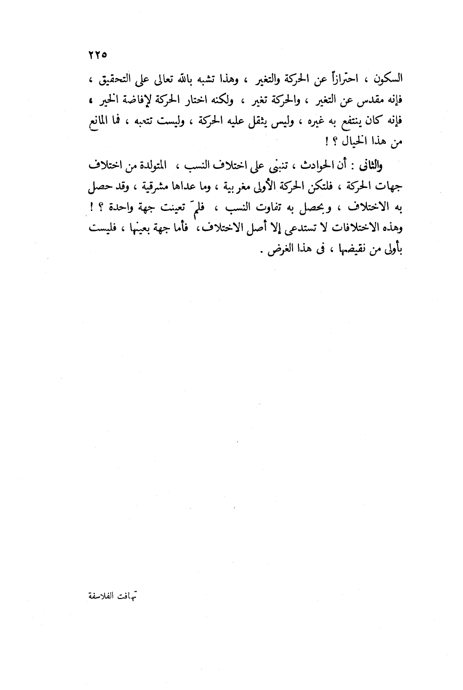 ومهما كان للفلك تصور لجزئيات الحركات وإحاطة بها أحاط لا محالة بما يلزم منها من اختلاف النسب مع الأرض من كون بعض أجزائه طالعة وبعضها غاربة وبعضها في وسط سماء قوم وتحت قدم قوم، وكذلك يعلم ما يلزم من اختلاف النسب التي تتجدد بالحركة من التثليث والتسديس والمقابلة والمقارنة إلى غير ذلك من الحوادث السماوية إما بغير واسطة وإما بواسطة واحدة وإما بوسائط كثيرة. وعلى الجملة فكل حادث فله سبب حادث إلى أن ينقطع التسلسل بالارتقاء إلى الحركة السماوية الأبدية التي بعضها سبب للبعض. فإذن الأسباب والمسببات في سلسلتها تنتهي إلى الحركات الجزئية السماوية فالمتصور للحركات متصور للوازمها ولوازم لوازمها إلى آخر السلسلة.