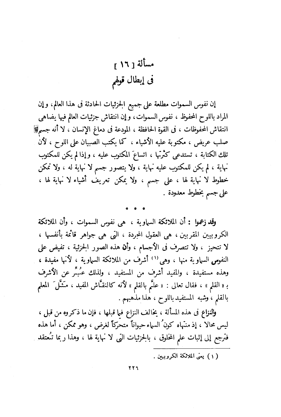 ونحن إنما لا نعلم ما يقع في المستقبل لأنا لا نعلم جميع أسبابها ولو علمنا جميع الأسباب لعلمنا المسببات، فإنا مهما علمنا أن النار سيلتقي بالقطن مثلاً في وقت معين فنعلم احتراق القطن ومهما علمنا أن شخصاً سيأكل فنعلم أنه سيشبع، وإذا علمنا أن شخصاً سيتخطى الموضع الفلاني الذي فيه كنز مغطى بشيء خفيف إذا مشى عليه الماشي تعثر رجله بالكنز وعرفه فنعلم أنه سيستغني بوجود الكنز. ولكن هذه الأسباب لا نعلمها وربما نعلم بعضها فيقع لنا حدس بوقوع المسبب فإن عرفنا أغلبها وأكثرها حصل لنا ظن ظاهر بالوقوع. فلو حصل لنا العلم بجميع الأسباب لحصل بجميع المسببات، إلا أن السماويات كثيرة ثم لها اختلاط بالحوادث الأرضية وليس في القوة البشرية الاطلاع عليه، ونفوس السموات مطلعة عليها لاطلاعها على السبب الأول ولوازمها ولوازم لوازمها إلى آخر السلسلة.