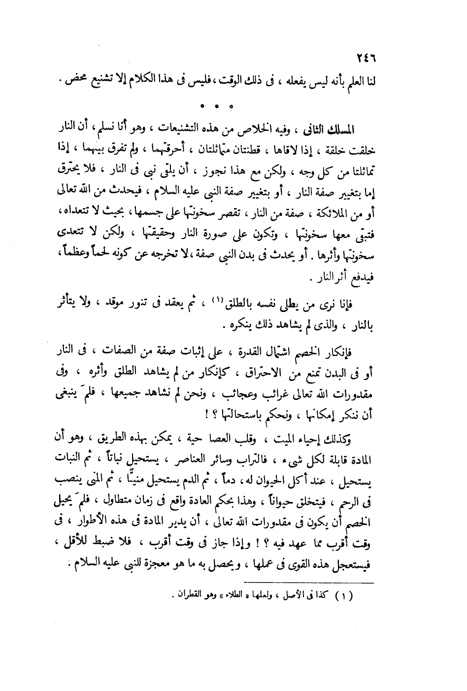 المسلك الثاني وفيه الخلاص من هذه التشنيعات وهو أن نسلم أن النار خلقت خلقة إذا لاقاها قطنتان متماثلتان أحرقتهما ولم تفرق بينهما إذا تماثلتا من كل وجه، ولكنا مع هذا نجوز أن يلقى نبي في النار فلا يحترق إما بتغيير صفة النار أو بتغيير صفة النبي فيحدث من الله أو من الملائكة صفة في النار يقصر سخونتها على جسمها بحيث لا تتعداه فيبقى معها سخونتها وتكون على صورة النار وحقيقتها ولكن لا تتعدى سخونتها وأثرها أو يحدث في بدن الشخص صفة ولا يخرجه عن كونه لحماً وعظماً فيدفع أثر النار.