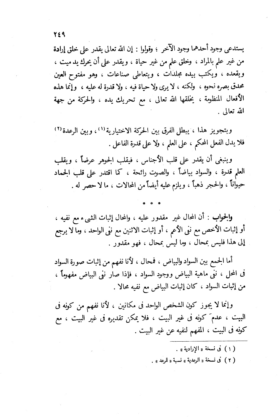 أما الجمع بين السواد والبياض فمحال لأنا لا نفهم من إثبات صورة السواد في المحل نفي هيئة البياض ووجود السواد فإذا صار نفي البياض مفهوماً من إثبات السواد كان إثبات البياض مع نفيه محالاً. وإنما لا يجوز كون الشخص في مكانين لأنا نفهم من كونه في البيت عدم كونه في غير البيت فلا يمكن تقديره في غير البيت مع كونه في البيت المفهم لنفيه عن غير البيت.