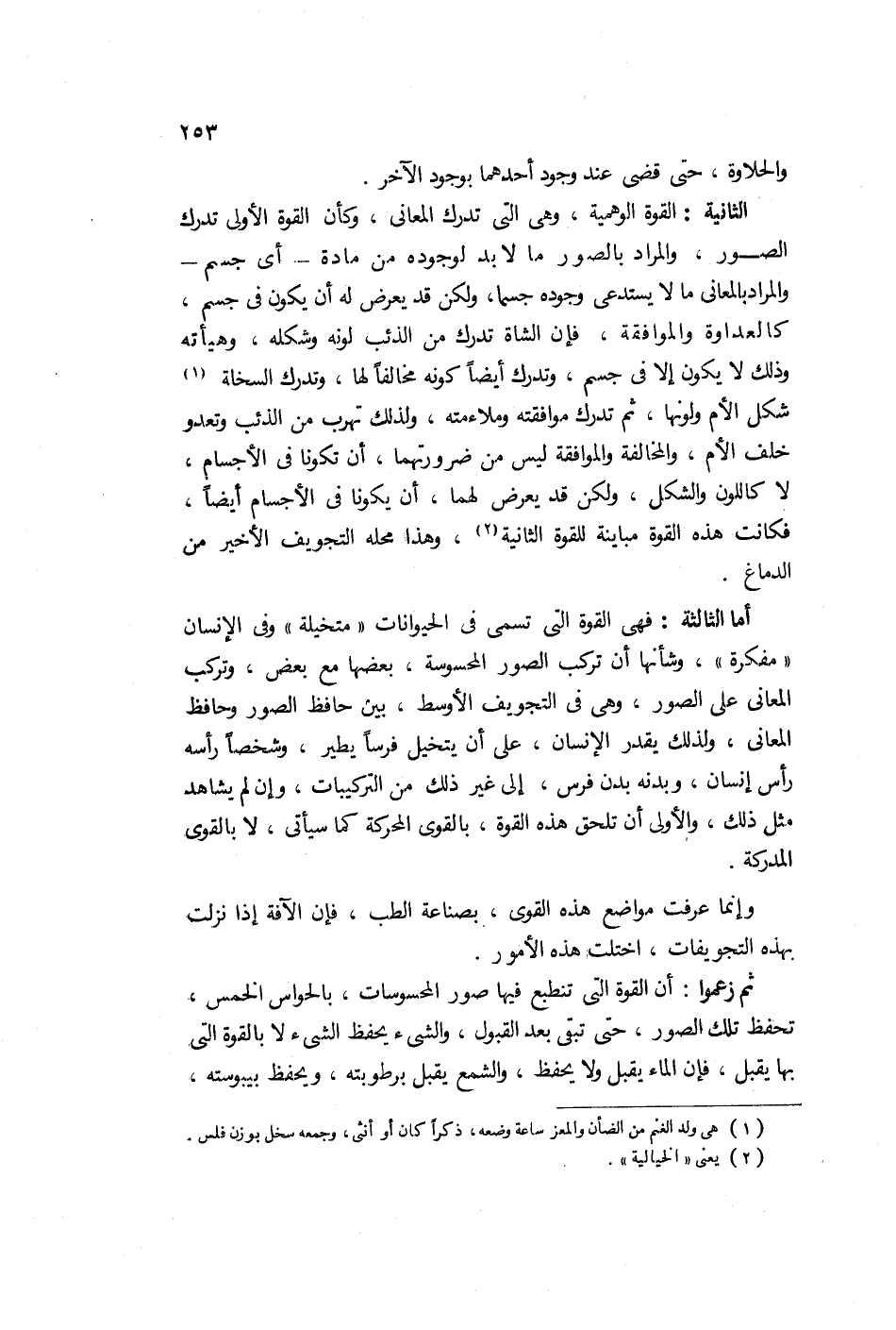 والثانية القوة الوهمية وهي التي تدرك المعاني، وكان القوة الأولى تدرك الصور. والمراد بالصور ما لا بد لوجوده من مادة أي جسم، والمراد بالمعاني ما لا يستدعي وجوده جسماً ولكن قد يعرض له أن يكون جسم كالعداوة والموافقة، فإن الشاة تدرك من الذب لونه وشكله وهيئته، وذلك لا يكون إلا في جسم، وتدرك أيضاً كونه مخالفاً لها. وتدرك السخلة شكل الأم ولونه ثم تدرك موافقته وملايمته ولذلك تهرب من الذئب وتعدو خلف الأم. والمخالفة والموافقة ليس من ضرورتها أن تكون في الأجسام لا كاللون والشكل ولكن قد يعرض لها أن تكون في الأجسام أيضاً فكانت هذه القوة مباينة للقوة الثانية وهذا محله التجويف الأخير من الدماغ.