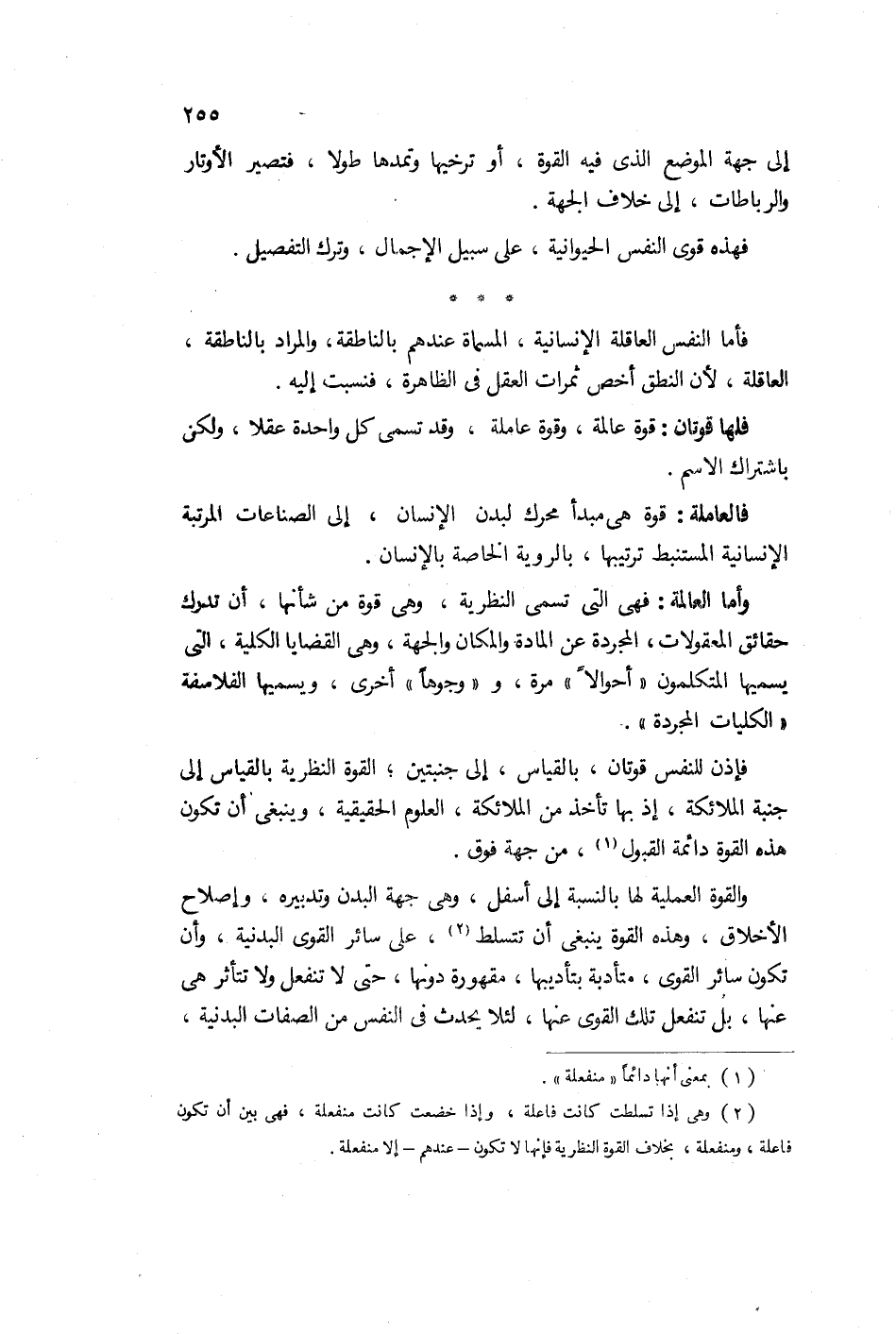 فأما النفس العاقلة الإنسانية المسماة الناطقة عندهم، والمراد بالناطقة العاقلة لأن النطق أخص ثمرات العقل في الظاهر، فنسبت إليه فلها قوتان: قوة عالمة وقوة عاملة، وقد يسمى كل واحدة عقلاً ولكن باشتراك الاسم. فالعاملة قوة هي مبدأ محرك لبدن الإنسان إلى الصناعات المرتبة الإنسانية المستنبط ترتيبها بالروية الخاصة بالإنسان. وأما العالمة فهي التي تسمى النظرية وهي قوة من شأنها أن تدرك حقائق المعقولات المجردة عن المادة والمكان والجهات، وهي القضايا الكلية التي يسميها المتكلمون أحوالاً مرة ووجودها أخرى وتسميها الفلاسفة الكليات المجردة.