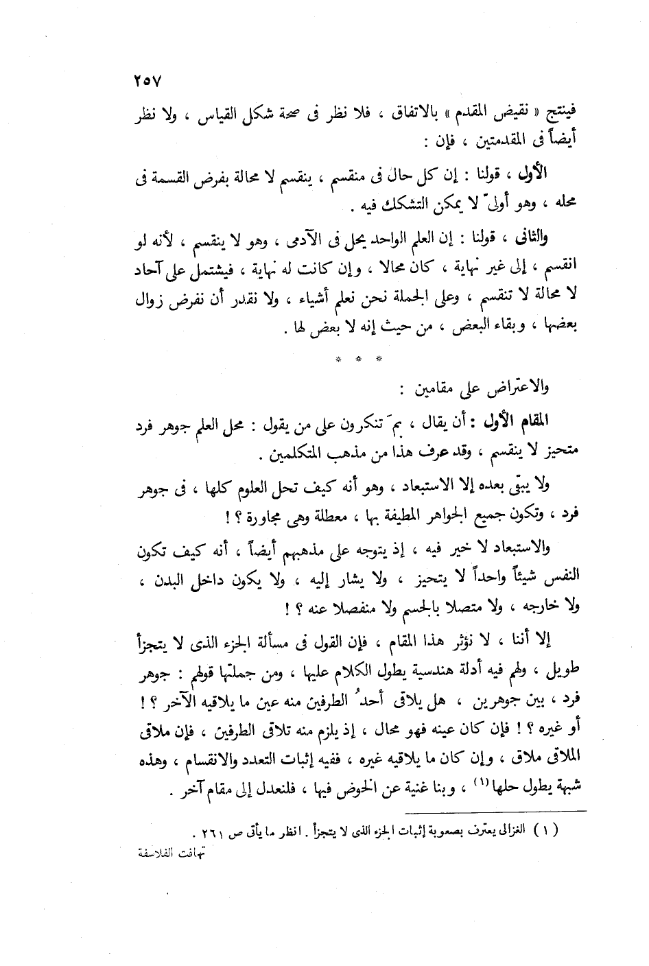 فينتج نقيض المقدم بالاتفاق فلا نظر في صحة شكل القياس ولا أيضاً في المقدمتين فإن الأول قولنا إن كل حال في منقسم ينقسم لا محالة بفرض القسمة في محله وهو أولي لا يمكن التشكك فيه، والثاني قولنا إن العلم الواحد يحل في الآدمي وهو لا ينقسم لأنه لو انقسم إلى غير نهاية كان محالاً وإن كان له نهاية فيشتمل على آحاد لا محالة لا تنقسم. وعلى الجملة نحن نعلم أشياء ولا نقدر أن نفرض زوال بعضها وبقاء بعض من حيث أنه لا بعض لها.