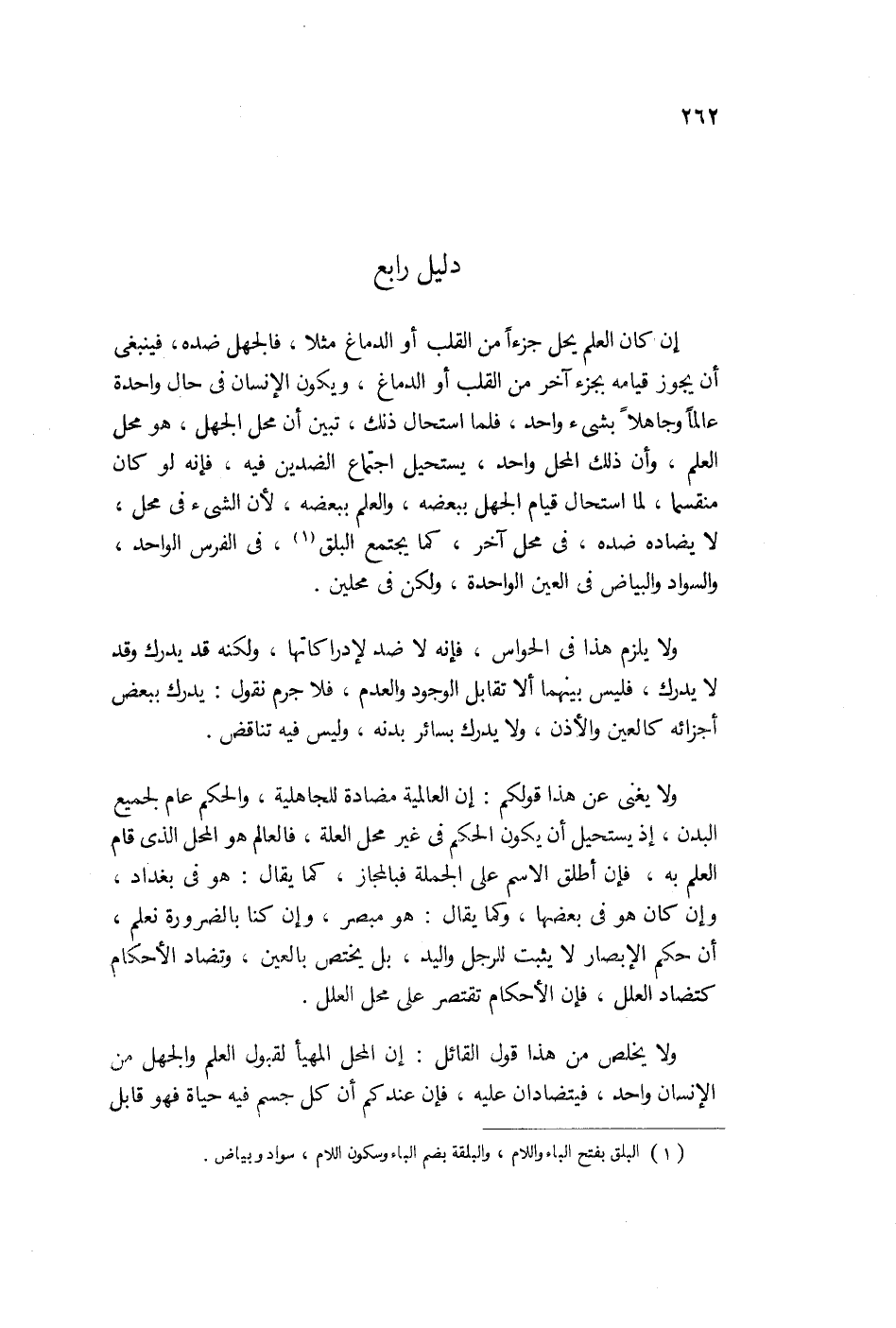 إن كان العلم يحل جزءاً من القلب أو الدماغ مثلاً فالجهل ضده فينبغي أن يجوز قيامه بجزء آخر من القلب أو الدماغ ويكون الإنسان في حالة واحدة عالماً وجاهلاً بشيء واحد، فلما استحال ذلك تبين أن محل الجهل هو محل العلم وأن ذلك المحل واحد يستحيل اجتماع الضدين فيه فإنه لو كان منقسماً لما استحال قيام الجهل ببعضه والعلم ببعضه لأن الشيء في محل لا يضاده ضده في محل آخر، كما تجتمع البلقة في الفرس الواحد والسواد والبياض في العين الواحدة ولكن في محلين.