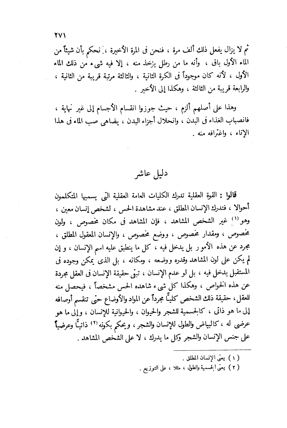 ثم لا يزال يفعل كذلك ألف مرة فنحن في المرة الأخيرة نحكم بأن شيئاً من الماء الأول باق وأنه ما من رطل يؤخذ منه إلا وفيه شيء من ذلك الماء لأنه كان موجوداً في الكرة الثانية، والثالثة قريبة من الثانية والرابعة من الثالثة وهكذى إلى الآخر. وهذا على أصلهم ألزم حيث جوزوا انقسام الأجسام إلى غير نهاية، فانصباب الغذاء في البدن وانحلال أجزاء البدن يضاهي صب الماء في هذا الإناء واغترافه عنه.