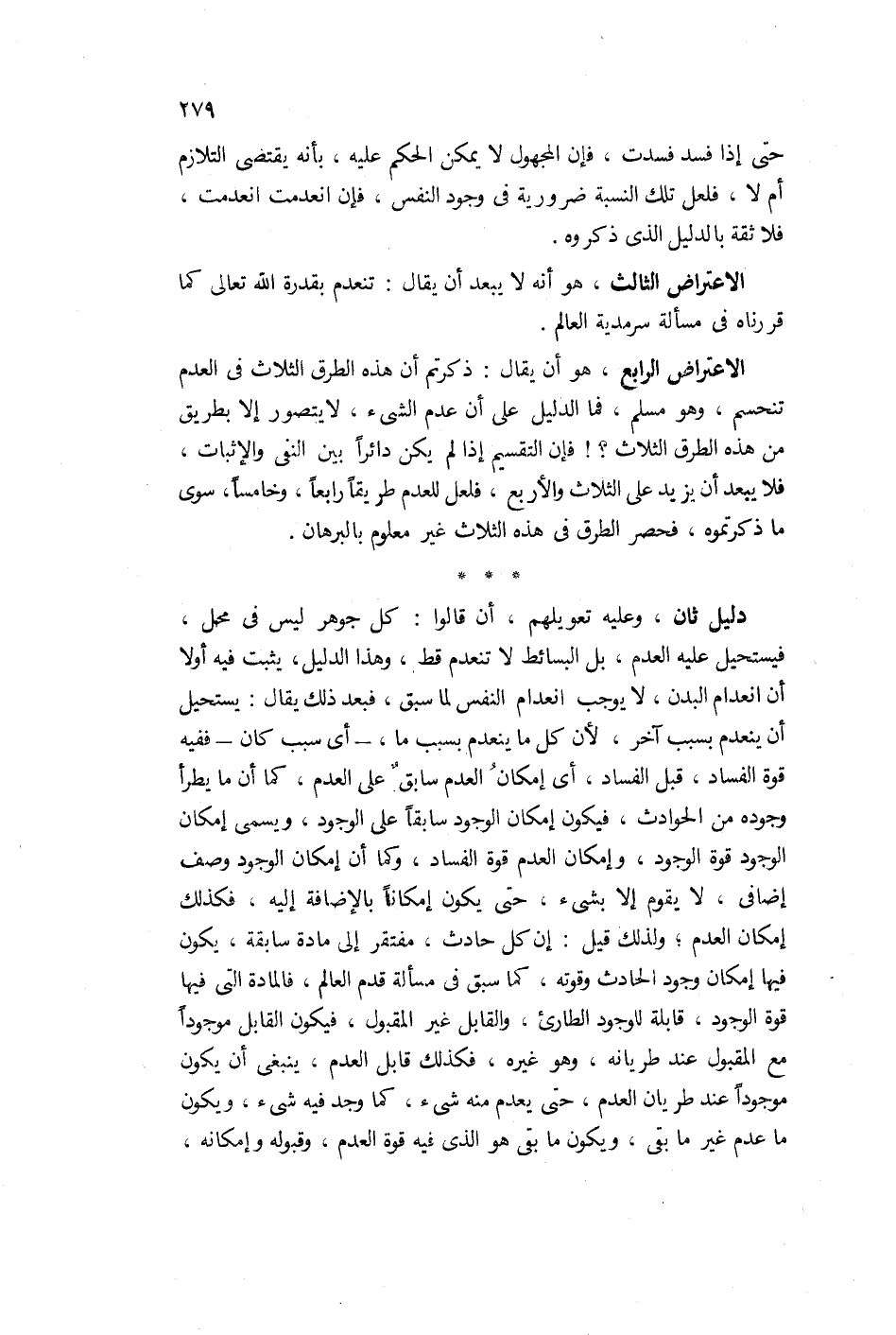 الاعتراض الرابع هو أن يقال: ذكرتم أن هذه الطرق الثلث في العدم تنحسم، فهو مسلم. فما الدليل على أن عدم الشيء لا يتصور إلا بطريق من هذه الطرق الثلث؟ فإن التقسيم إذا لم يكن دائراً بين النفي والإثبات فلا يبعد أن يزيد على الثلث والأربع، فلعل للعدم طريقاً رابعاً وخامساً سوى ما ذكرتموه، فحصر الطرق في هذه الثلث غير معلوم بالبرهان.
